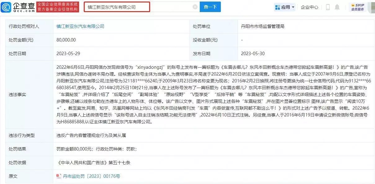 近日,东风本田4S店借车震宣传新车被罚8万元事件迅速登上热搜。企查查APP显示,东风本田丹阳新亚东4S店关联公司镇江新亚东汽车有限公司因违反广告内容管理规定,被丹阳市市场监督管理局罚款8万元。