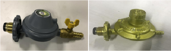 提示三 瓶装液化石油气调压器不得带有可调节功能、应有过流切断装置 液化石油气调压器俗称减压阀或调压阀,GB 35844-2018 《瓶装液化石油气调压器》对产品结构有明确要求,即调压器不得带有可调节功能。(如下图:左图为带调节功能的调压器,右图为不带调节功能的调压器) ![]()