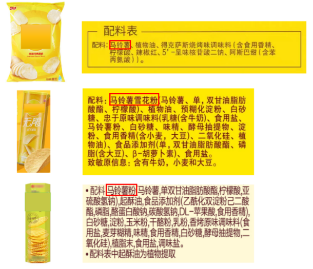 从薯片包装上的配料表可以发现,不同薯片的主要配料不同,除了马铃薯,还有马铃薯雪花粉、马铃薯粉等。以马铃薯为主要配料的薯片,也被称为“原切薯片”,由新鲜土豆直接切成薄片油炸而成;以马铃薯雪花粉或马铃薯粉为主要配料的薯片,并不需要用新鲜的土豆片,而是将马铃薯雪花粉或马铃薯粉混合淀粉后压制成薯片形状,再进行油炸或非油炸工艺制作而成,这样的薯片形状一致,便于包装。