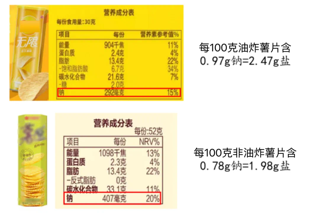 不仅如此,每100克“非油炸”薯片的盐含量达到1.98克,虽比油炸薯片稍微低了一些,但仍属于高盐食品。