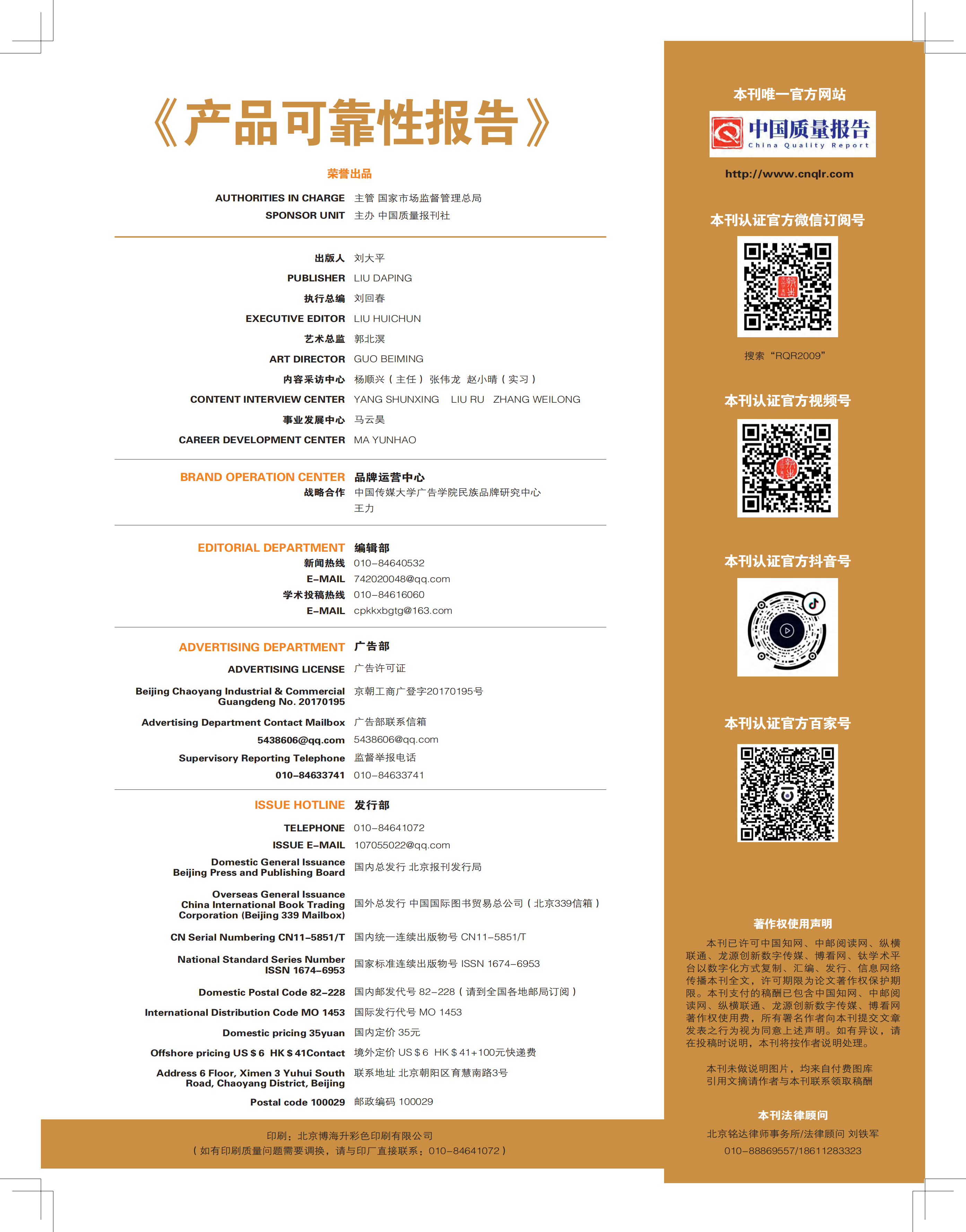 ![]() ![]() ![]() 《产品可靠性报告》由国家市场监督管理总局主管、中国质量报刊社主办,国内外公开发行,基于大数据,以质量管理、质量技术、质量安全为视点,以数据型、研究型报告为主的科技月刊。 《产品可靠性报告》在杂志的基础上,形成官方网站、微信公众号、抖音号等的融媒体阵营。 “产品可靠性”概念狭义上是产品在使用期间没有发生故障的性质,广义上是指使用者对产品的满意程度或对企业的信赖程度。 《产品可靠性报告》关注产品用户体验和品牌美誉度,关注产品耐用性和故障率、产品缺陷,把产品的安全性、稳定性和可靠性放在共同的层面下,用数据说话,以客观的眼光进行观察,宗旨是透视缺陷产品,揭秘质量差异。 《产品可靠性报告》重点关注汽车、电器、食品、化妆品、IT电子、房屋家居、数字科技、健康、直播电商等领域。 主要内容: 1、解读国家、总局及地方与质量、安全及可靠性相关的政策法规; 2、分析、测评、报告产品的质量、安全及可靠性; 3、开展满意度调查,发出用户的声音,关注消费体验; 4、推荐质量好、安全、可靠的产品并介绍其生产制造商的先进技术,交流管理经验; 5、关注有质量缺陷的产品以及这些产品的生产制造商,促进产品质量缺陷的解决、生产制造商质量管理及技术的提高; 6、可靠性标准的推进和讨论、可靠性技术的传播和发展、可靠性理论的灌输和争鸣。 《产品可靠性报告》风格权威、严肃但不失亲民。内容忌深奥晦涩,行文力求通俗易懂,用大众能读的懂、看的明白的表达方式阐述专业的问题。 欢迎订阅全新内容的 《产品可靠性报告》杂志 月订价:35元/册+12元快递费 年订价12期:420元+144元快递费=564元 联系方式: 订阅电话:010-84641072 联系电话:010-84640532 联系地址:北京市朝阳区育慧南路3号 邮编:100029 |