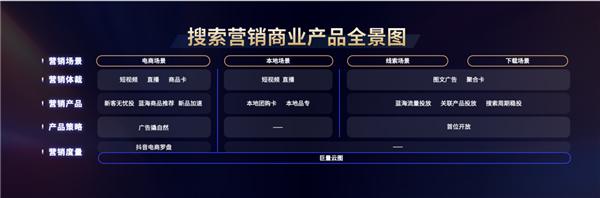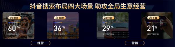 今天 , 搜索已渗入人们生活的方方面面 , 高效链接用户真实诉求的搜索 , 也为商家打开更广阔的增长空间。 9 月 20 日 , 以 " 搜见未来 , 索定先机 " 为主题的 2023 巨量引擎搜索广告营销大会正式举办 , 聚焦电商、本地、线索、下载四大场景的生意经营需求 , 解读巨量引擎搜索营销产品能力和行业解决方案 , 助力商家把握搜索这一战略新机遇。 ![]() 01 迅猛增长的搜索流量 , 不容错失的战略新机遇 在抖音 , 搜索已成为链接用户与信息的重要枢纽。据 2023 年巨量引擎平台数据显示 , 抖音搜索体量 3 年涨幅超 3 倍 , 超过 9 成的用户已经建立或初步养成搜索习惯。当前 , 抖音搜索结果覆盖 200 多个内容垂类 , 既涵盖影视、生活等用户兴趣内容 , 也包括教育、游戏、汽车等高生意价值的类目。 抖音丰富的内容生态 , 精准承接并放大了用户搜索流量。短视频中的 " 相关搜索 "、搜索框下的 " 猜你想搜 "、评论互动场景的吸顶词等 , 都成为用户搜索的重要场景。随着抖音 " 启发式搜索 " 不断深入用户生活 , 用户已培养起从搜内容到搜商品、搜服务的深度搜索习惯。 凭借持续提升的流量规模、不断培育的用户习惯 , 搜索在电商、本地、线索、下载不同生意场景下 , 都能为商家带来明确增量。 ![]() 为进一步帮助商家拥抱搜索机遇 , 巨量引擎也从扩大流量供给、提供行业专项扶持、搭建人才培养体系以及完善整合服务能力等方面加大投入 , 助力商家掘金搜索新蓝海。 ![]() 02 全场景产品能力升级 , 助攻经营撬增量 如今 , 每天都有大量用户在搜索后购买商品、购买团购、预约咨询、下载使用产品。巨量引擎也在不断优化适配四大场景的产品营销能力 , 帮助商家用搜索激发确定性增长。 ![]() 电商搜索 : 从入驻到经营 , 一站式服务护航增长 过去一年 , 抖音日均电商搜索量增长 93%, 电商搜索是撬动增长的关键枢纽。巨量引擎搜索广告则帮助商家实现从入驻到经营的全阶段增长。 ![]() 入驻阶段 , 商家可以通过「新客无忧投」, 享受最长 7 日的搜索流量扶持和无订单赔付双重激励 , 快速测品加速订单转化。 经营阶段 , 商家可借助「商品卡」广泛触达高潜客群 , 提升投后 CVR 和 CTR; 运用「蓝海商品推荐」发现搜索量大、供给少、竞争力低的适配商品 , 以低出价获取更多流量机会 ; 借助「新品加速」快速度过冷启动阶段 , 实现新品突围。 长效经营阶段 , 商家可以通过「巨量云图」获取投放全阶段策略指导 , 运用「抖音电商罗盘」理清生意经营状况 , 科学高效地达成确定性增长。 本地搜索 : 生活服务全面链接 , 产品组合力促转化 近一年 , 抖音生活服务相关搜索流量超过 100 亿 , 截至去年底 , 超过 200 万门店入驻抖音并实现 GMV 的翻倍增长。巨量引擎本地搜索产品也在不断升级 , 为商家提供创新解决方案。 本地团购卡便是其中之一 , 优化拓展综搜和团购垂搜的多渠道入口 , 精准拓展本地流量。在暑假出行旺季 , 长隆欢乐世界借助本地团购卡推广 , 短短一周内团购订单便带来超 100 万 GMV。下季度 , 巨量引擎将推出团购卡直投产品 , 商家可在 App 和 PC 端直接投放团购卡的广告 , 并可通过 App 端长周期投放 , 实现门店稳定客流。 ![]() 团购 + 直播 + 品专组合 , 也能倍速提升搜索 GMV: 团购让利配合品专流量收口 , 及时沉淀高意向人群至品牌私域 , 配合直播促成转化。数据显示 , 在团购 + 直播 + 品专组合加持下 , 商家千次搜索 GMV 有效提升 46%。 ![]() 线索下载搜索 : 投放全旅程再升级 , 突破瓶顶高效拓客 除了帮助商家在经营场收获好生意 , 巨量引擎还在营销场进行搜索广告升级 , 陪伴商家投放全旅程 , 高效提升拓客效果和效率。 ![]() 在流量供给方面 , 即将推出「蓝海流量宝」, 通过蓝海搜索词推荐 , 帮助广告主发现蓝海流量机会、提高跑量效率。 在内容体裁方面 , 新增原生图文样式 , 降低广告主创意制作门槛 , 提升投放效率。同时 , 适配线索及下载行业的「聚合卡」, 可帮助广告主提升获客效率。测试数据显示 , 聚合卡可有效帮助搜索渠道下载量提升 137%, 点击转化提升 15%。 商品化投放方面 , 巨量引擎进一步完善关联广告产品或服务信息 , 助力广告主提高广告竞争力 , 聚集精准流量提升转化效率。另外 , 广告主还可以借助以 7 天为周期的「周期稳投」, 解决投放成本波动大等难题 , 实现智能投放及优化。 ![]() 03 分行业解决方案升级 , 助力商家赛道突围 有力扶持与优质产品是重要助力 , 但想要真正做好生意 , 商家还需要适配行业特性的精准玩法。 深入经营全链路 , 让线索转化提质增效 以营销场的线索行业为例 , 受决策周期长、转化路径复杂等行业属性影响 , 提高线索有效性、转化效率是商家的普遍难题。 能够锁定精准流量的搜索广告 , 不仅可以有效渗透高潜客群 , 撬动自然流量与商业流量 , 还能帮助商家打通完整的线索搜集与转化链路。 汽车品牌别克是通过搜索撬动新增量的典型案例之一。别克加强搜索品专投放 , 触达存量 A3 人群的同时获取新流量 , 并通过搜索竞价投放和搜后落地页承接 , 实现投放后 7 天日均搜索人数增加 84%, 搜索到店转化率和搜索成交率分别提升 15% 和 20%。 ![]() 内容广告双管齐下 , 下载行业拥抱长效增长 下载行业已度过粗放式买量阶段 , 想要实现用户增长与付费增长 , 商家需做好精细内