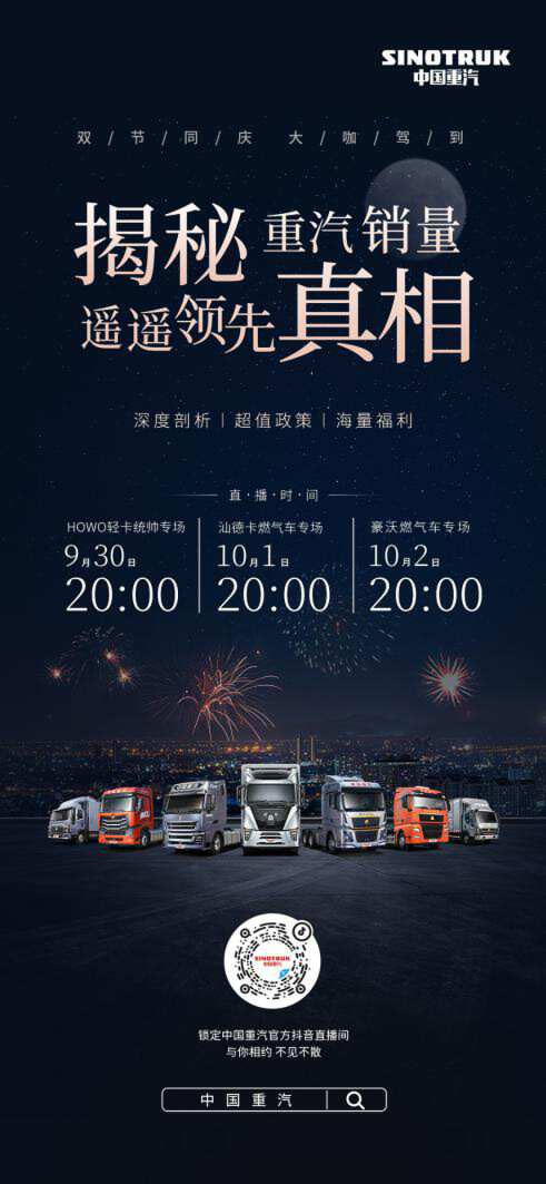 关注中国重汽官方抖音平台,预约直播,这个“双节”我们不见不散!