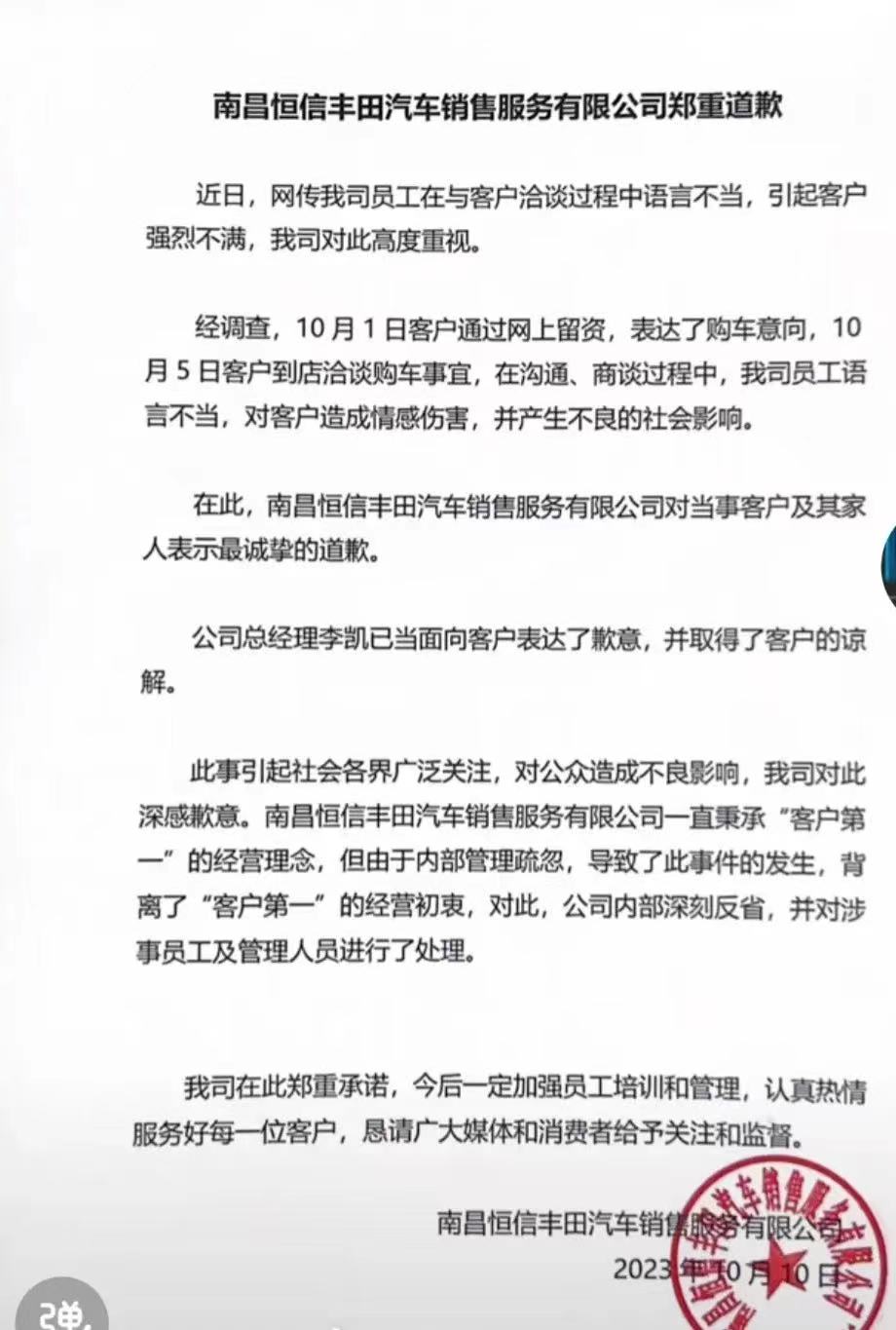 事后,昌恒信一汽丰田店火速发布道歉函,声称公司总经理李凯已经当面向客户表达了歉意,并取得了客户的谅解。 面对这份歉意书,网友似乎并不买账 此事依旧炙手可热,视频依然被广泛传播,声讨声也是鼎沸之势。 才华横溢的网友将视频中涉事销售员做成了各种表情包、动画、甚至是脱离了人类界,直接P成动物朋友。 显然 道歉失效了 这究竟是为何? 对此,消费者有消费者的想法,仔细梳理发现,消费者对此次道歉不满意,认为处理态度及方式存在问题。另外,事件本身也反映出汽车销售行业“喜贷”“厌全”的情况。 道歉声明中表示,公司内部深刻反省,并对涉事员工及管理人员进行了处理。既已处理,那么是怎么处理的?却没有提及。 网友调侃处理就是口头警告“下次注意点,骂他们的时候不要被拍视频”,涉事销售爆粗口反问大家,“TMD有完没完了”。在网友和经销商的争吵过程中,寡不敌众的一汽丰田关闭了评论区。 但闭口不言绝非处理问题的真正态度,消费者仍在等待一汽丰田的真挚道歉和令人信服的处置结果。 除了这场争执是非对错,我们还应该关注到事件本身,汽车行业推崇贷款消费、按揭消费。在视频中,清晰看到一汽丰田4S店内挂着一条醒目的横幅,上边写着:全款是冲动的消费,按揭是理性的投资。 产品可靠性以消费者的身份咨询了北京几家汽车销售店,无一例外,同样推荐贷款买车。据内部销售人员爆料,消费者选择贷款购车他们的提成会更高。 如今,一汽丰田客服电话、官方公众号、抖音、微博,均已“沦陷”,可谓骂声一片;有网友爆料出涉事员工私人账号,人肉个人信息;还有爆料南昌恒信一汽丰田店的电话,鼓吹大家直至“打爆”。 这场令人深感愤怒的事件,刺痛了消费者的自尊、丢掉了服务行业的宗旨,也破坏了人与人之间的平等关系。 事件让人愤怒,但事件不应让人疯狂。当然,在舆论持续发酵过程中也有人保持住了理智。不停地呼吁大家,“涉事的是个别销售人员,不要攻击其他无辜的客服人员”。 维权要合法 维护正义要合规 在合法合规的情况下 合理的表达消费者的意愿 传递消费者的诉求 |