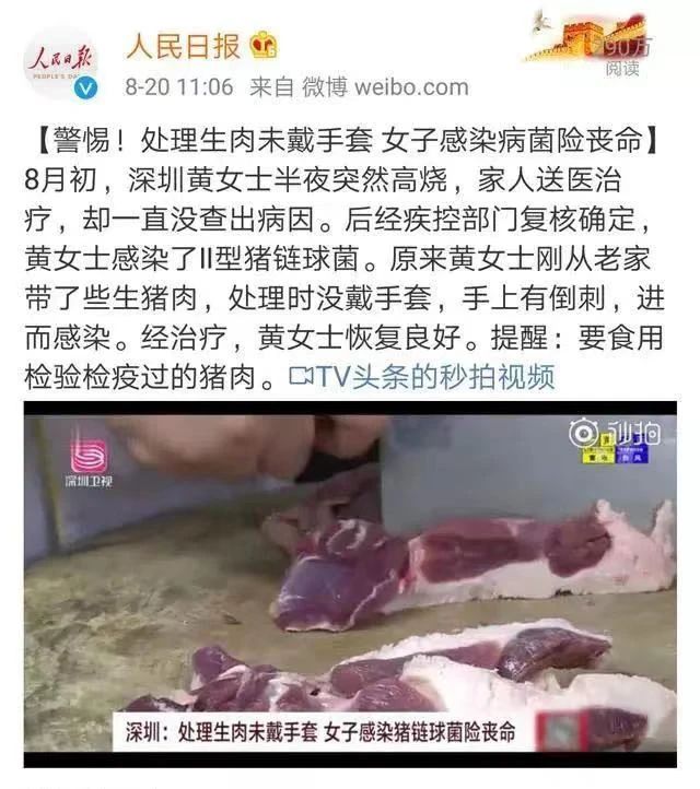 医生敏锐发现,患者左手大拇指有伤口。 据家属描述 发病前连续几天 该男子都有洗、切猪肉,给家人煮猪肉粥 医生推测该男子是在处理生猪肉时 不慎感染猪链球菌 果然,在进一步完善检查中 在他脑脊液中找到了猪链球菌 最终确诊患者为猪链球菌脑膜炎 其实在深圳 也曾有人不幸中招