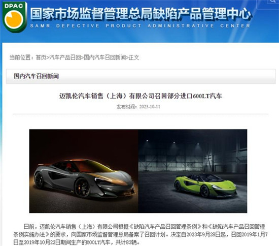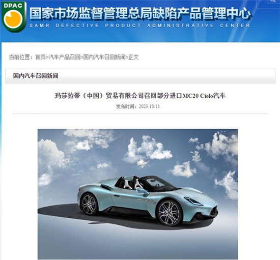 中国经济网10月13日讯(记者 郭跃)10月11日,国家市场监督管理总局发布3起乘用车召回公告,涉及保时捷、迈凯伦、玛莎拉蒂三大超级跑车品牌的共计2662辆进口车将被召回。