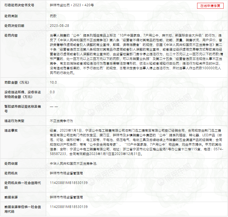 近日,公牛集团全资子公司宁波公牛电工销售有限公司因不正当竞争行为,对其商品作虚假或者引人误解的商业宣传,被钟祥市市场监督管理局罚款10万元。 产品可靠性报告致电企业,截至发稿前,电话暂未接通。随后记者咨询公牛官方旗舰店淘宝客服,客服表示对此事不了解。