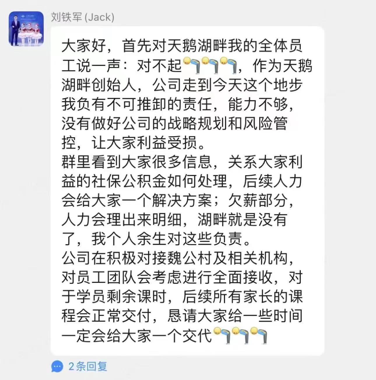 拖欠工资,老师加入维权队伍 除了学生家长,由于被拖欠工资,“天鹅湖畔”的很多授课老师加入了维权队伍。“下午还在上课,晚上11点多接到公司发布的声明。”北京“天鹅湖畔”老师称,10月14日当天,还在和同事们正常上班,但到了下午就感到了一些异样——给领导们打电话发消息全部都没有回复。当晚11点,“天鹅湖畔”创始人刘铁军在公司内部群发的公告,告知公司遭遇危机,并表示后续将就员工社保、公积金、薪资等问题做出解决方案。 另外,苏州“天鹅湖畔”授课的老师提到,总部的运营员工们也向授课老师诉苦。“他们一直在跟我们说,他们也是受害者,他们没有工资,他们损失的钱和工资要比我们多。”这位老师说,自己2022年入职天鹅湖畔,被拖欠了4万多的工资,她现在不得已加入了苏州家长们的维权群,和家长们共享相关消息。 家长质疑其他艺术机构接手 根据“天鹅湖畔”微信公众号10月14日晚上的公告,北京某大型艺术教育综合体将承接“天鹅湖畔”全国直营门店,该艺术综合体将为天鹅湖畔直营门店学员在剩余课时和剩余金额范围内提供免费公益授课服务,帮助完成学员的复课、消课,但不承担任何学员的退费、补偿、赔偿等财务支付义务。