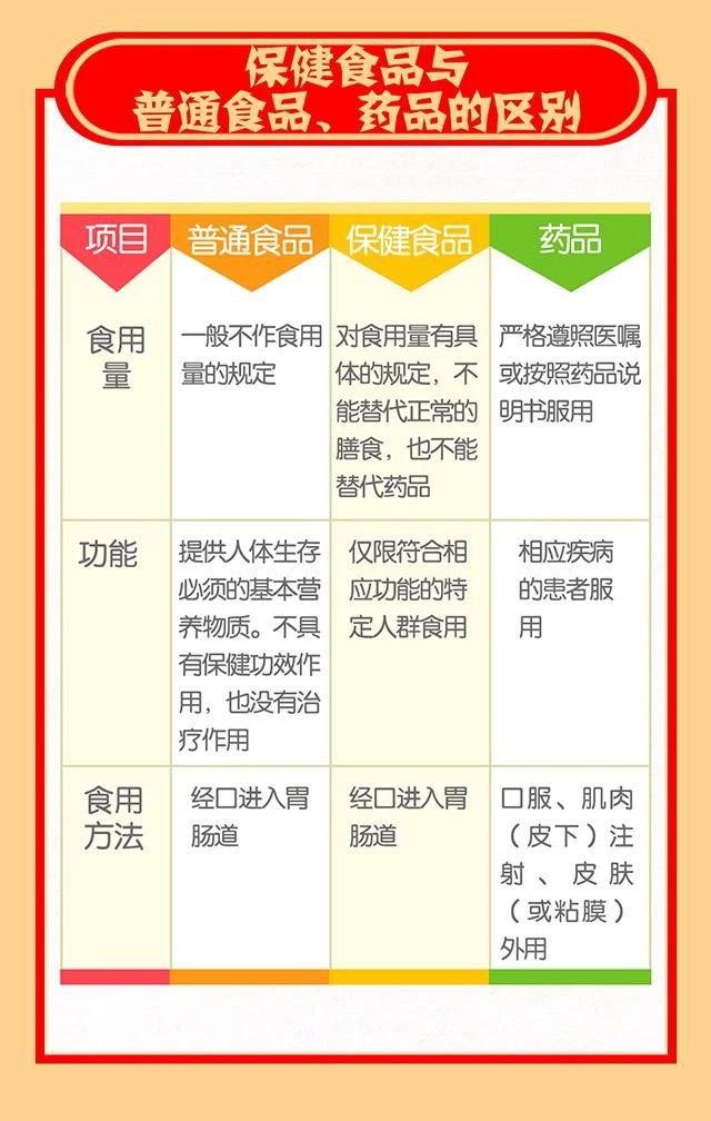 保健食品VS普通食品 共性 保健食品和普通食品都能提供人体生存必需的基本营养物质(食品的第一功能),都具有特定的色、香、味、形(食品的第二功能)。 区别 (1)保健食品含有一定量的功效成分(生理活性物质),可以调节人体的机能,具有特定的功能(食品的第三功能);而普通食品不强调特定功能(食品的第三功能)。 (2)保健食品一般有特定的食用范围(特定人群),而普通食品无特定的食用范围。 在普通食品中也含有生理活性物质,由于含量较低,在人体内无法达到调节机能的浓度,不能实现功效作用。保健食品中的生理活性物质是通过提取、分离、浓缩(或是添加了纯度较高的某种生理活性物质),使其在人体内达到发挥作用的浓度,从而具备了食品的第三功能。 食品中还有一类特殊营养食品,是“通过改变食品的天然营养素的成分和含量比例,以适应某些特殊人群营养需要的食品”。如适应婴幼儿生理特点和营养需要的婴幼儿食品、经添加营养强化剂的食品,都属于这类食品。 保健食品VS特殊营养食品 共性 都添加或含有一定量的生理活性物质,适于特定人群食用。 区别 前者不需要通过动物或人群实验,不需要证实有明显的功效作用;而后者必须通过动物或人群实验,证实有明显、稳定的功效作用。 保健食品VS药品 保健食品不以治疗疾病为目的 主要调节人体的机能,并且对人体不产生任何急性、亚急性或者慢性危害,适宜于特定人群食用。 保健食品的本质仍然是食品 虽有调节人体某种机能的作用,但它不是人类赖以治疗疾病的物质。对于生理机能正常,想要维护健康或预防某种疾病的人来说,保健食品是一种营养补充剂。对于生理机能异常的人来说,保健食品可以调节某种生理机能。 药品是治疗疾病的物质 药品是有明确的治疗目的和治疗疾病相应的适应症和功能主治,可以有不良反应发生,有规定的使用期限,不仅有口服还有注射、外用等多种使用途径和剂型。
