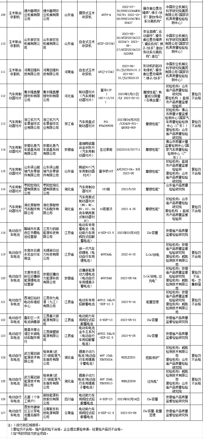 近期,市场监管总局组织储水式电热水器等8种产品质量国家监督抽查。现将抽查情况通报如下: 基本情况 (一)抽查概况。共抽查检验1175批次产品,涉及1102家生产单位、102家销售单位,发现不合格产品127批次。其中,储水式电热水器27批次、吸油烟机24批次、快热式电热水器16批次、童车4批次、泵34批次、玉米联合收割机6批次、汽车用制动器衬片6批次、电动自行车电池10批次(详见附件1)。 (二)跟踪抽查情况。跟踪抽查到上次抽查不合格生产单位49家,其中有9家生产单位产品仍不合格(详见附件2)。 抽查结果分析 (一)储水式电热水器。在广东、浙江、山东、上海等10个省份144家生产单位抽样,共抽查145批次产品。抽查发现27批次产品不合格。不合格产品中,有12批次产品安全项目电源连接和外部软线不合格。 (二)吸油烟机。在广东、浙江、江苏、山东等11个省份150家生产单位抽样,共抽查151批次产品。抽查发现24批次产品不合格。不合格产品中,有6批次产品对触及带电部件的防护不合格,4批次产品接地措施不合格,3批次产品外部导线用接线端子不合格,3批次产品结构不合格,以上均为安全项目不合格。 (三)快热式电热水器。在浙江、广东、江苏、上海等8个省份73家生产单位抽样,共抽查73批次产品。抽查发现16批次产品不合格。不合格产品中,有7批次产品结构不合格,4批次产品电源连接和外部软线不合格,3批次产品输入功率和电流不合格,3批次产品接地措施不合格,以上均为安全项目不合格。 (四)童车。在河北、浙江、广东、江苏等11个省份169家生产单位抽样,共抽查173批次产品。抽查发现4批次产品不合格。不合格产品中,静态强度、前后稳定性、活动部件间的间隙、小零件等安全项目,分别有1批次不合格。 (五)泵。在北京、河北、山西、辽宁等16个省份300家生产单位抽样,共抽查300批次产品。抽查发现34批次产品不合格,其中1批次产品涉嫌假冒。不合格产品中,有8批次产品安全项目接地装置不合格,19批次产品规定点流量与扬程项目不合格。 (六)玉米联合收割机。在山东、河北、吉林、黑龙江等7个省份20家生产单位抽样,共抽查20批次产品。抽查发现6批次产品不合格。不合格产品中,有6批次产品操作者位置处噪声不合格,6批次产品梯子/扶手不合格,3批次产品发动机的起动和停机不合格,以上均为安全项目不合格。 (七)汽车用制动器衬片。在湖北、河北、浙江、安徽等19个省份172家生产单位抽样,共抽查172批次产品。抽查发现6批次产品不合格,均存在安全项目摩擦性能不合格问题。 (八)电动自行车电池。在江苏、安徽、浙江、福建等14个省份102家销售单位抽样,共抽查141批次产品,涉及江西、江苏、湖北、浙江等14个省份的74家生产单位。抽查发现10批次产品不合格,其中1批次产品涉嫌假冒。不合格产品中,有2批次产品安全项目过充电不合格,1批次产品安全项目短路保护不合格。 有关要求 针对本次产品质量国家监督抽查发现的问题,各有关省级市场监管部门要按照《产品质量法》《产品质量监督抽查管理暂行办法》等有关要求,迅速组织做好监督抽查结果处理工作,并及时将处理情况录入e-CQS系统。对不合格产品,要依法采取查封、扣押等措施,严禁生产销售;涉嫌假冒的,要通过现场检查、询问情况、查阅合同发票等方式调查取证,查清违法事实,从严从快从重处置。对不合格产品生产销售单位,要明确整改要求,严格督促落实整改措施,及时组织复查;对连续两次抽查不合格的生产单位,要开展约谈。违法行为涉嫌犯罪的,要及时移送司法机关。要督促生产销售单位落实质量安全主体责任,按要求配备质量安全总监和质量安全员,建立日管控、周排查、月调度工作制度。总局将加强抽查结果处置情况的跟踪督办,并视情通报。 产品质量国家监督抽查127批次不合格产品及生产销售单位名单