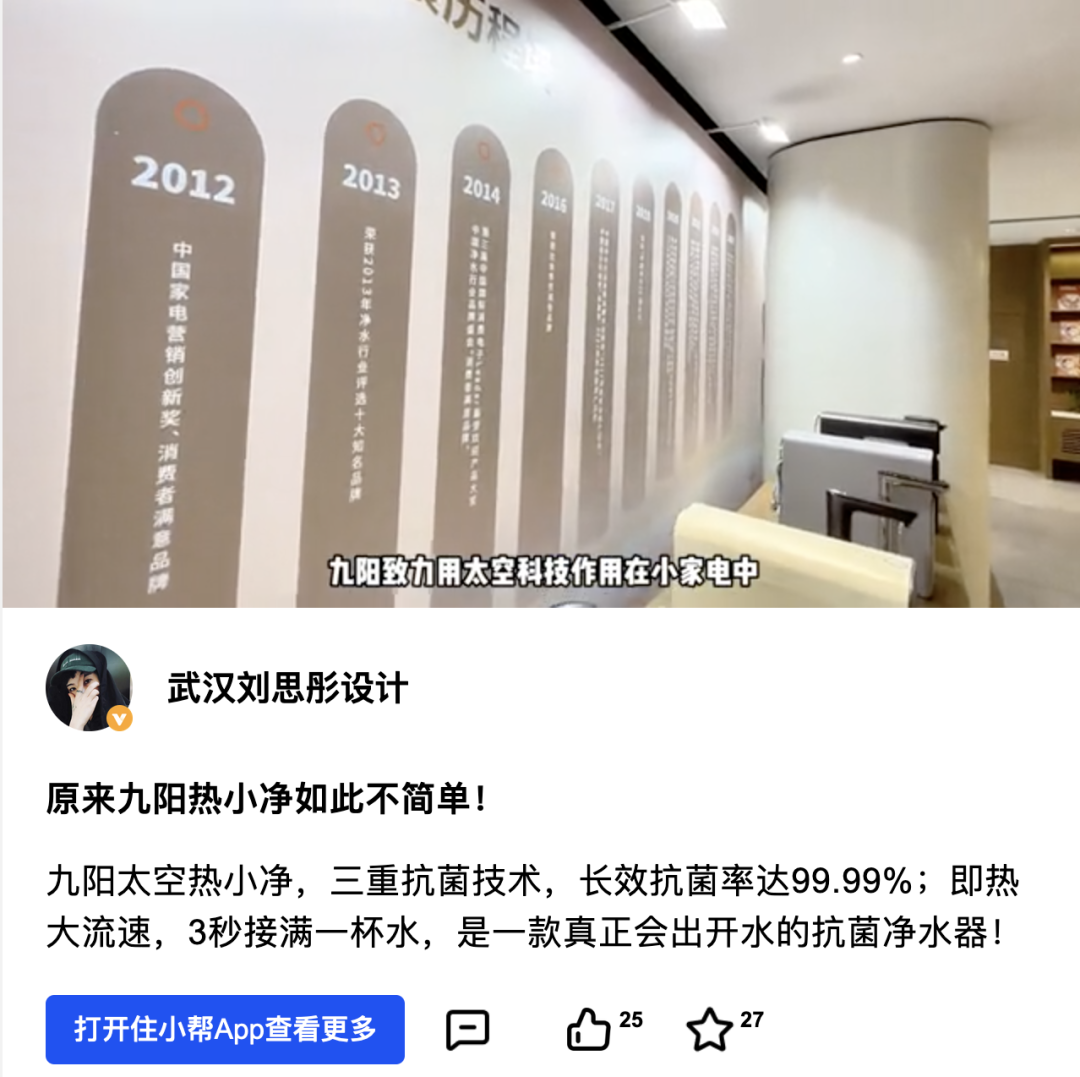 ![]() 多平台种草渗透用户心智,构建立体式品牌信任状 拥有专业能力与信任背书的家装设计师们,是九阳沟通目标用户的高效切入口。住小帮与九阳联动参访的@杭州中石、@锦哉、@弥高设计、@深白设计 等8位设计师,在抖音、住小帮、小红书、好好住、今日头条等多个平台发布热小净产品种草视频,广覆盖家居家装圈层用户,设计们也通过结合产品特点与家装设计方案,展示九阳产品带给屋主的真实生活加分体验,为用户提供决策参考。 例如,在@玖柞设计 的种草视频中,他从居住祖孙三代的家庭居住需求切入,为客户展示他的舒适家居设计思路,并在水家电的筛选过程中为大家推荐九阳热小净系列产品,展示使用过程、总结产品优势;@眼界空间 则分享了她近期为人宠家庭提供的家居改造方案成效——通过层层选定的九阳热小净系列产品,让客户和孩子都能实现饮水健康。 ![]() 此外,九阳还与参访设计师@刘思彤 合作深度探厂视频,通过设计师的亲身体验与讲解,为用户展现九阳的研发制造实力,提升用户的信任感与品牌心智。在@刘思彤 的探厂视角下,用户们跟随着她的镜头了解到,九阳是我国载人航天净水技术合作伙伴,并从 2013 年开始成为载人航天太空厨房研制单位,致力于让航天员能喝上干净的热水。 同时,九阳也逐渐将「太空科技」引入到寻常百姓家,给净水器细菌滋生、二次污染、加热慢和滤芯寿命短等困扰行业和消费者多年的难题提供新的解决方案。 ![]() 通过“设计师分享应用案例与亲身体验”的形式种草,九阳的品牌实力被设计师们实际见证并多元展示,同时,设计师们拥有不同的粉丝受众与不同的家居设计风格,能够在多平台形成多圈层、多内容偏好角度的种草内容矩阵,由此增强用户信任与好感,构建立体式品牌信任状,让“即热即饮、无需改造水电布线、航天抗菌科技、滤芯自清洗”等产品关键词走进用户心里。 结语 在本次合作中,住小帮基于“针对家居家电用户的精准洞察力、庞大且优质的设计师生态资源、不断迭代的创新性营销解决能力”三大能力优势,帮助九阳打通“设计师种草-设计师工业游-设计师沉浸式产品体验-设计师闭门调研会议-发布会联合授牌-高层晚宴”的长链路合作模式,进一步拓展品牌影响力,提高产品热度,促进生意增长。 未来,住小帮将通过家居设计垂类生态的持续升级,为用户带来优质的家居设计方案,为设计师们提供更多的商业化可能性,帮助更多赛道类目的家居家电品牌带来创新营销思路。 |