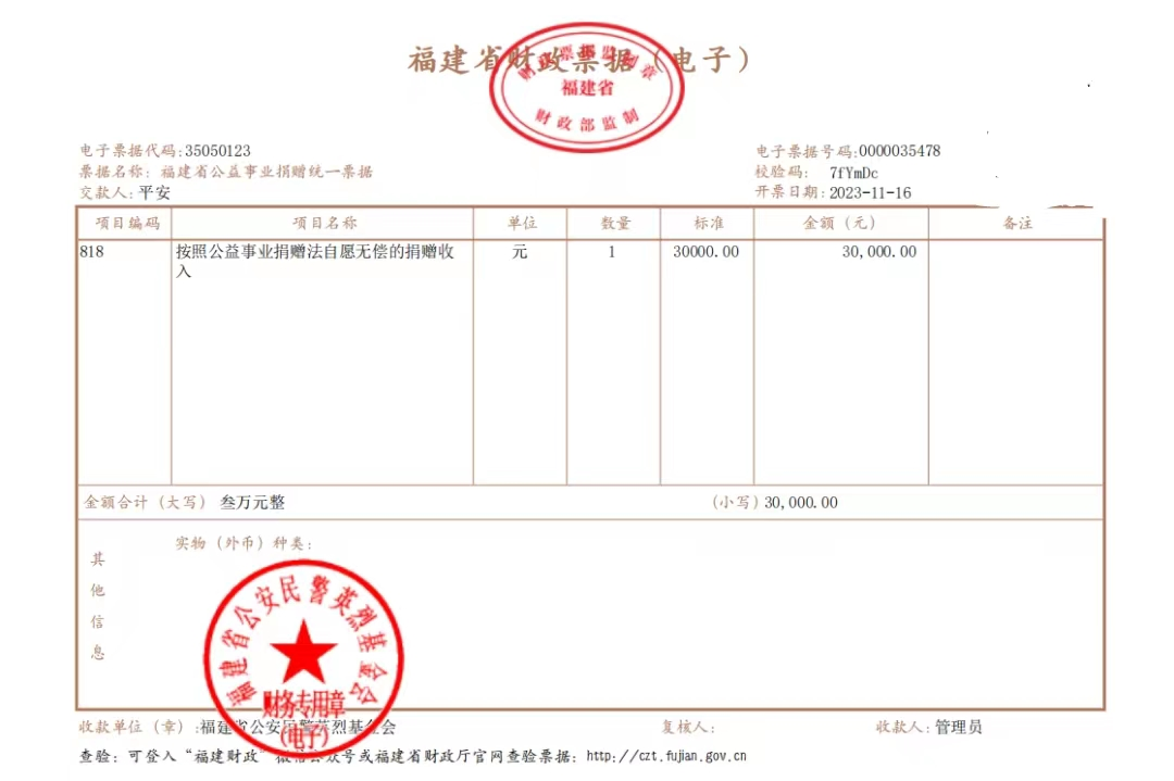 自 2019年,“平安夫妇”每年都到英烈基金会捐赠善款,连续五年共六次累计捐赠12万元。做一次善事不难,难的是一直在做善事。这“无约”胜“有约”的坚持,令人敬佩,充分体现了老夫妇俩高尚的慈善情怀,以及对英烈基金会的信任,对公安民警的至善大爱,对公安工作的关心支持。 |