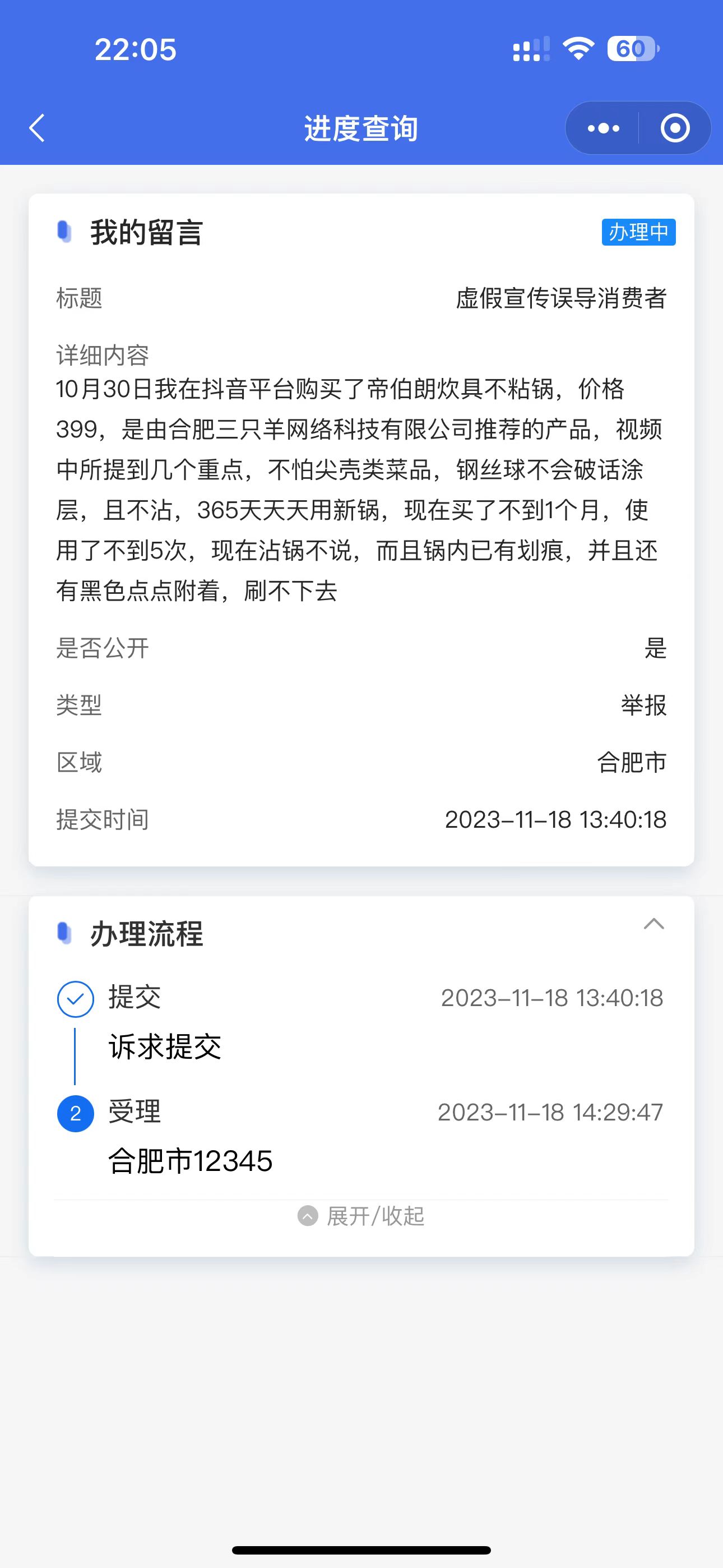 11月22日,中国消费者协会发布2023年“双11”消费维权舆情分析报告,小杨哥徒弟“红绿灯的黄”被列入低俗带货案例。 然而在中消协点名前,小杨哥因涉嫌虚假宣传,刚被“退一赔三”。 近日,来自北京的张先生投诉三只羊网络公司涉嫌虚假宣传,误导消费者。 10月30日张先生在抖音平台购买了帝伯朗炊具不粘锅,价格399元,是由合肥三只羊网络科技有限公司推荐的产品,小杨哥宣传视频中所提到几个重点,“不怕尖壳类菜品,钢丝球不会破坏涂层,且不沾,365天天天用新锅。但是张先生买了不到1个月,使用了不到5次,不仅沾锅,而且锅内已有划痕,并且锅体内还附着有黑色斑点。 意识到手中锅非小杨哥宣讲视频中的锅,小杨哥口中的“家人们”也会“上当”,张先生开始了维权之路。 历经了帝伯朗售后、三只羊网络售后、王海打假,12345市长热线,在张先生极力申诉下,问题才得以解决,最终依法获得三倍赔偿金额。 产品可靠性了解发现,帝伯朗不粘锅屡遭投诉,消费者一再抱怨,宣传与实际不相符合;与帝伯朗同在风口上的小杨哥直播间,此次也并非第一次被诟病涉嫌虚假宣传。 帝伯朗商家、三只羊一再拒绝售后服务,投诉12345秒到账 “11月10号收到不粘锅,我家不常做饭,仅用了四、五回就发现了粘锅问题,不仅粘锅还附着黑点、脱皮的现象”,张先生说。他先向三只羊网络公司售后发起质疑,然而却从未收到回复。 “我发了很多文字,显示已读却没回复过”。张先生又向帝伯朗商家申请赔偿,聊天界面显示,帝伯朗商家表示,可以退货退款,但要求张先生先寄回锅,张先生以保留证据为由拒绝了商家的要求,同时要求商家先行赔付。 几经拉扯,商家同意进行赔款,值得一提的是,商家表示只愿意赔付399元,见此情形,张先生有些愤怒地称商家在“搞笑”,并直言要求赔偿三倍,退一赔三,支付1596元。由于价格出入,沟通再次陷入统一话术,商家一再强调寄回样品、先支付399元再进行其他赔付,而张先生则坚持自己意见,主张退一赔三,先赔再寄。 张先生再次感慨道:“我与商家协商期间,这个过程中又多次联系三只羊,但还是未收到任何回复”。只读不回让张先生感到气愤,聊天记录表达出了张先生的不满,张先生对商家、三只羊售后写道“再和你们多说一句我是孙子,自己会通过其他途径进行维权”。于是,他通过微信公众号平台联系了安徽12345,并上传视频记录,申诉赔偿。