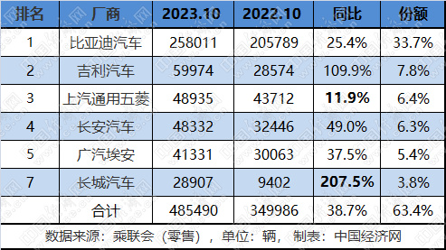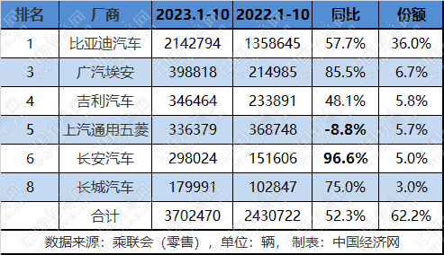 前10月,广汽埃安累计销量为398818辆,距离其全年50万辆的销量仍有10.1万辆的差距。这也意味着广汽埃安在接下来的11、12两月,月均销量需达到5万辆以上,相对来看有一定压力。 另一个需要关注的是吉利汽车,其10月销量接近6万辆,同比增幅更是超过1倍,排名一举跃升至第二位。前10月,吉利汽车新能源销量则达到34.6万辆,排名超过上汽通用五菱位居广汽埃安之后;在今年剩下不到两个月的时间里,吉利能否将这一排名延续至最后,也将成为传统新能源车市一大看点。 当前,在极氪、吉利银河和几何等品牌带动下,吉利汽车新能源销量已连续三个月创出新高,在集团内占比也突破至34%。在本届广州车展上,吉利银河首款纯电旗舰轿车——银河E8迎来亮相,进一步拓展银河产品矩阵。