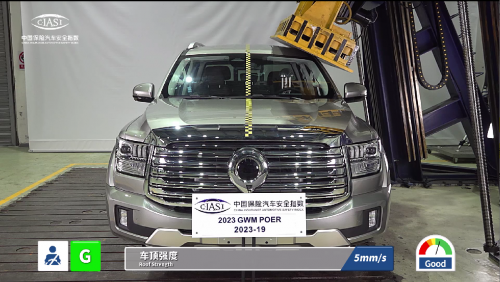 作为一款大型高性能豪华皮卡,户外越野是家常便饭,但野外穿越稍有不慎就会遭遇翻滚、落石等突发情况,对车顶承压能力带来巨大挑战。实际测试中,山海炮获得G(优秀)评级,强质比系数为4.62,即车顶可承重11.5吨,表明其车身具备优秀的抗变形能力,在突发翻滚、重物挤压等危急情况下,能够更好的保护车内乘员不受伤,创造足够逃生空间。