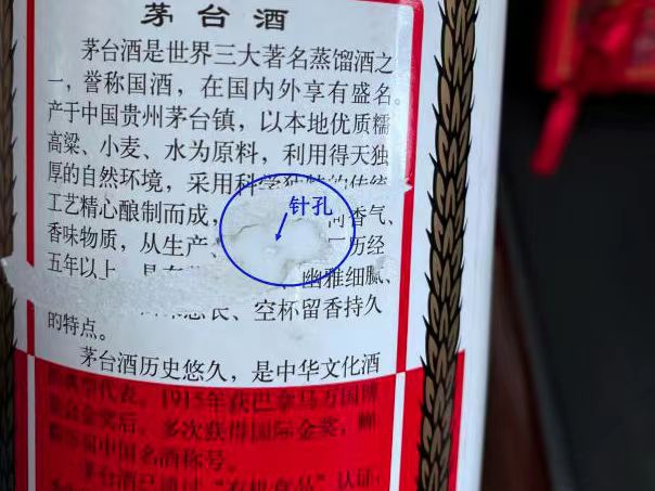 市场监管执法人员立即赶赴现场,经随机抽查,现场5箱共计30瓶酒,均发现了酒瓶背标处有打孔痕迹。执法人员对现场的95瓶53°飞天茅台酒采取了扣押的行政强制措施,并立即联系茅台酒厂派驻浙江的鉴定人员上门鉴定。经过两日的细致辨认,发现“钻孔”酒76瓶,这些酒的瓶身标签揭开后,均能找到头发丝大小的针孔!