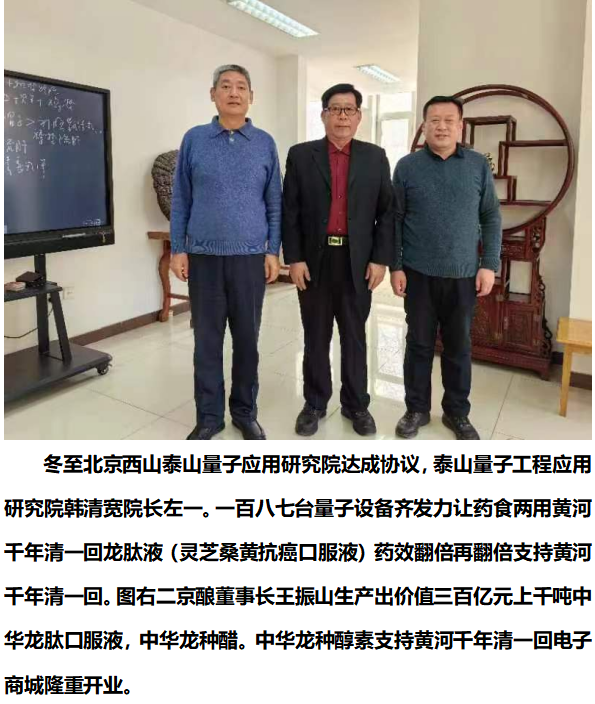 桑树上生长出来的灵芝桑黄,古人称桑舌、龙舌灵芝桑黄是无毒副作用的珍贵的抗肿瘤上上药。工厂化生产药食两用高于食品安全等级的黄河千年清一回龙肽液、龙肽胶囊,对于消除人类隐性饥饿,增强人民体质抗击疫情、预防核辐射和重大恶性疾病将发挥重要作用。成绩应该归功于党中央大力支持我国中医药创新,弘扬中华民族优秀传统文化英明领导。 龙肽液龙肽胶囊、龙肽酵素等生物制药创新成果的横空出世不仅是华夏儿女炎黄子孙的福音也是全人类大健康的福音。 四年多来,黄河千年清一回喊出了全世界向往和平、健康、幸福生活七十亿人民的共同心声,更是以振兴实业的实际行动,传播中华五千年优秀传统文化、蚕桑精神,团队在学习吸收祖先文明智慧基础上,中华天伦集团总裁联合国科学院士李朝旺、泰山量子应用科学研究院韩清宽院长、国宝级中医、中医战略科学家、张国土世界非物质文化遗产院士、又创新发明出上百项举世震惊的高新技术成果。改良桑中华龙树原木枝条、桑根已经可以零污染零排放深加工出有机消炎抗病毒降三高效果神奇的清一回品牌面条、饼干、馒头、蛋糕、面包等等。可以深加工出会呼吸能释放负氧离子可食用有机等级药食两用的工业产品。如尿不湿、女用卫生巾、各种纸张、建筑装修材料都可以成为人类的食品、药品。她打通了农业通向现代高附加值工业生物制药的瓶颈。 这一项项造福全人类的特大发明喜讯,让全世界新闻工作者和三千多万新媒体网络管理从业者无不喜悦激动、纷纷义务免费转载传播。全世界亿万朋友圈转发,黄河千年清一回弘扬中国共产党新时代中华民族共同富裕,和平发展文明思想的万丈光芒,让全国军民和全世界人民日夜向往、回肠激荡。 黄河千年清一回作为弘扬中华文化文明创新智慧的新时代互联网全球公认的中华智慧科普教材,目前已经全面入住我国党政军工农商学兵各界官网、入驻全世界各国中央政府到地方各级政府官网、全球各国中央通讯社、新闻社媒体、学校,企业社团和至爱亲朋家族官网。