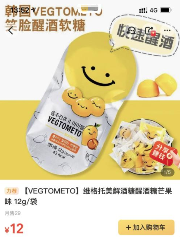 3·15在行动|解酒糖能解酒?查处! 解酒糖相信不少消费者都听说过 有的人说有效果 有的人说是骗人的 解酒糖到底有没有解酒的作用呢? 近日,江苏省南京市雨花台区市场监管局接到举报,反映一家网店铺销售的糖果,标题上使用“解酒”字样,但实际只是普通食品,并没有解酒的功能和效果。 接到投诉举报线索后,雨花台区市场监管局执法人员对该店铺的网页进行截图,商品标题为“VEGTOMETO维格托美解酒糖醒酒糖芒果味 12g/袋”,同时,在商品页面的主图,上传了写有“酒前预防,酒后醒酒”的图片。虽然店铺提供了“姜黄软糖对醉酒模型小鼠解酒作用的实验研究”的证明材料,但该材料被证明是伪造的,店铺也无法提供其他材料证明VEGTOMETO姜黄糖果是否具有解酒醒酒的作用。
