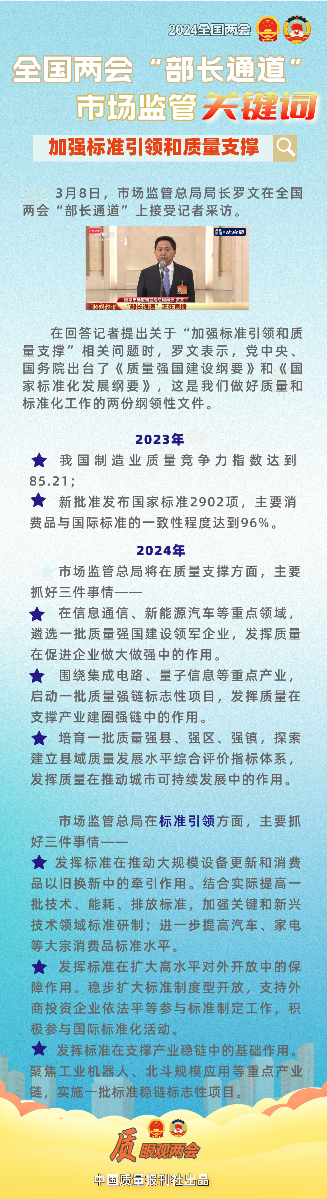一图读懂 | 罗文局长在“部长通道”介绍加强标准引领和质量支撑新措施 2024-03-08 昊星 产品可靠性报告 3月8日上午,市场监管总局局长罗文在2024年全国两会“部长通道”上接受记者采访,中国质量报刊社“质眼观两会”栏目为您带来图解报道。 上一篇:父亲辞世后宗馥莉首次公开亮相:娃哈哈要比消费者预期做得更好 下一篇:一图读懂 | 罗文局长在“部长通道”介绍加快全国统一大市场建设新措施