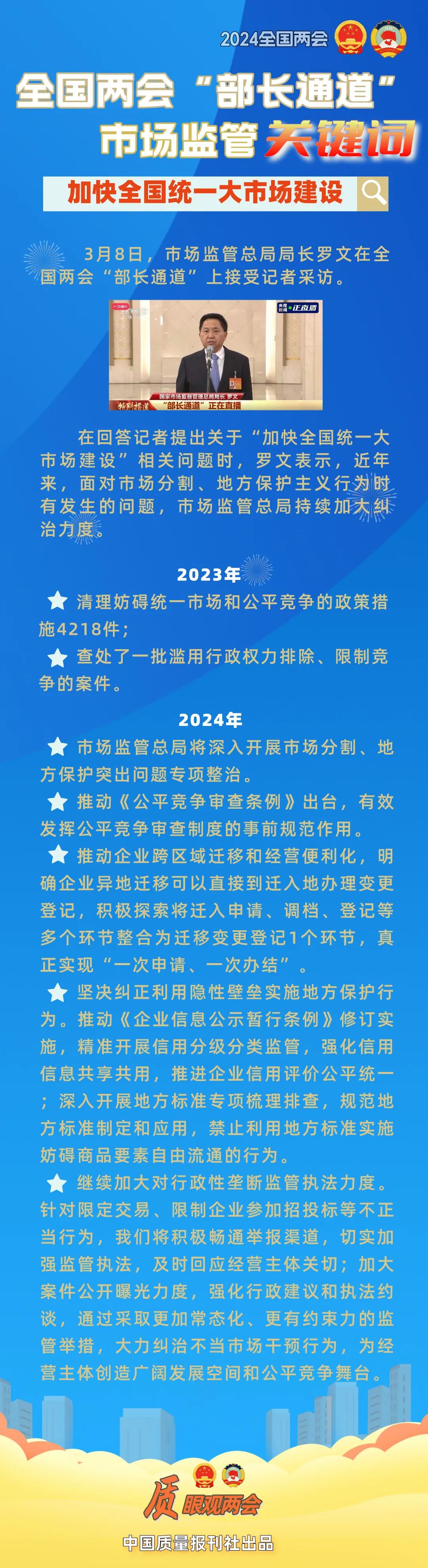 一图读懂 | 罗文局长在“部长通道”介绍加快全国统一大市场建设新措施 2024-03-08 昊星 产品可靠性报告 3月8日上午,市场监管总局局长罗文在2024年全国两会“部长通道”上接受记者采访,中国质量报刊社“质眼观两会”栏目为您带来图解报道。 上一篇:一图读懂 | 罗文局长在“部长通道”介绍加强标准引领和质量支撑新措施 下一篇:实录来了!罗文在两会“部长通道”答记者问