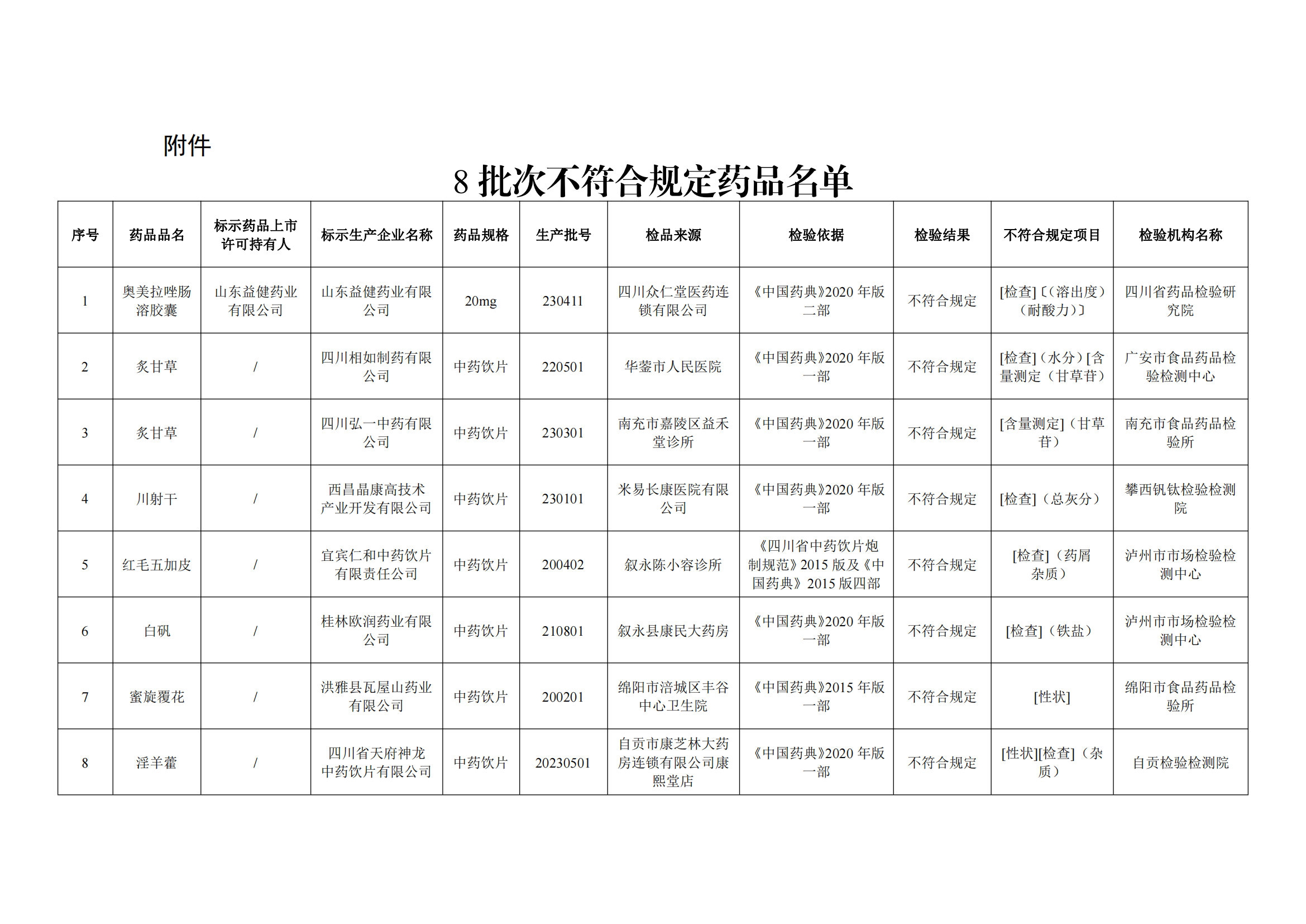 经四川省药品检验研究院检验,标示为山东益健药业有限公司生产的1批次奥美拉唑肠溶胶囊不符合规定,不符合规定项目为溶出度、耐酸力。经广安市食品药品检验检测中心检验,标示为四川相如制药有限公司生产的1批次炙甘草不符合规定,不符合规定项目为含量测定。经南充市食品药品检验所检验,标示为四川弘一中药有限公司生产的1批次炙甘草不符合规定,不符合规定项目为含量测定。经攀西钒钛检验检测院检验,标示为西昌晶康高技术产业开发有限公司生产的1批次川射干不符合规定,不符合规定项目为总灰分。经泸州市市场检验检测中心检验,标示为宜宾仁和中药饮片有限责任公司生产的1批次红毛五加皮不符合规定,不符合规定项目为药屑杂质。经泸州市市场检验检测中心检验,标示为桂林欧润药业有限公司生产的1批次白矾不符合规定,不符合规定项目为铁盐。经绵阳市食品药品检验所检验,标示为洪雅县瓦屋山药业有限公司生产的1批次蜜旋覆花不符合规定,不符合规定项目为性状。经自贡检验检测院检验,标示为四川省天府神龙中药饮片有限公司生产的1批次淫羊藿不符合规定,不符合规定项目为性状、杂质。根据通告,对上述不符合规定药品,药品监督管理部门已要求相关企业和单位采取暂停销售使用、召回等风险控制措施,对不符合规定原因开展调查并切实进行整改。四川省药品监督管理局要求相关药品监督管理部门依据《中华人民共和国药品管理法》,组织对上述企业和单位生产销售假劣药品的违法行为立案调查,并按规定公开查处结果。 |