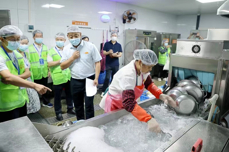 在该校饮食服务中心负责人戴前锋的带领下,大家参观了食堂就餐、后厨环境、物资库房,检查“三防”措施、和日常管理等工作,精细化的管理令人啧啧称赞。 戴前锋自豪地说,在管理上,食堂坚持做好“三查” 源头严防和“三清”过程管理。 “三查”即查从业人员资质、查食品供应渠道、查食品出库流程;“三清”即食堂存贮间必须保持空气清新,食堂使用各类菜品必须保证清鲜,加工操作流程必须保证清爽。 更让参观人员惊喜,作为食堂后厨,面积大、人员多、物资杂,但没有一只蚊子、苍蝇,所有地面不仅洁净且干燥,地面没有任何水渍。 紫园食堂还新增加了两台现代化的洗碗机,可实现餐具的精洗、高温消毒一体化作业。每套餐具经过4工序后,就完成了清洁干燥、高度消毒。