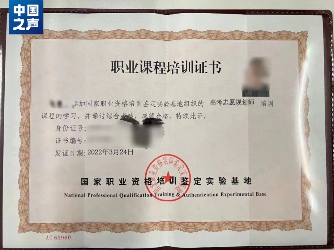 某机构对记者展示的高考志愿填报规划师证书 那么,高考志愿填报指导老师资格证是哪个部门颁发的?什么群体可以报考?这类资格证含金量高吗? 资格证对学历、经验均无要求 交几千元培训后即可获得 在网络上,记者查询到大量高考志愿规划师培训的课程,多家教育机构提供的课程方案显示,学员交上几千元学费,完成视频课程,就可以拿到高考志愿填报指导老师资格证或高考志愿规划师证书。 某机构销售称,这是一个比较火的职业,属于刚需产品。“我们会给学员提供完善体系的高考志愿规划师成长路径课程。教学是网课,录播为主,直播为辅,再加上模拟练习,三种模式相结合,目前有八十多节课。课程总价格是5980元,现在‘618’活动,费用是4980元。” 另一家正在招生的机构提供的图文资料显示,学费6000多元可以完成初、中、高三级课程。对方表示,上半年刚结束学习的学员当下已经在教育咨询机构为考生提供志愿规划服务了。当记者咨询,对报考人员的学历、经验有什么要求时,对方表示,学历在大专及大专以上,经历过高考,上过大学,基本上就可以通过培训,成为一名“高报师”。