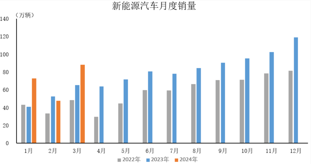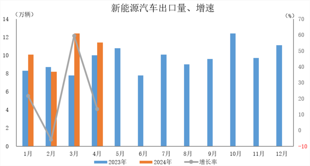 2024年4月,新能源汽车出口11.4万辆,环比下降8.6%,同比增长13.3%。2024年1-4月,新能源汽车出口42.1万辆,同比增长20.8%。