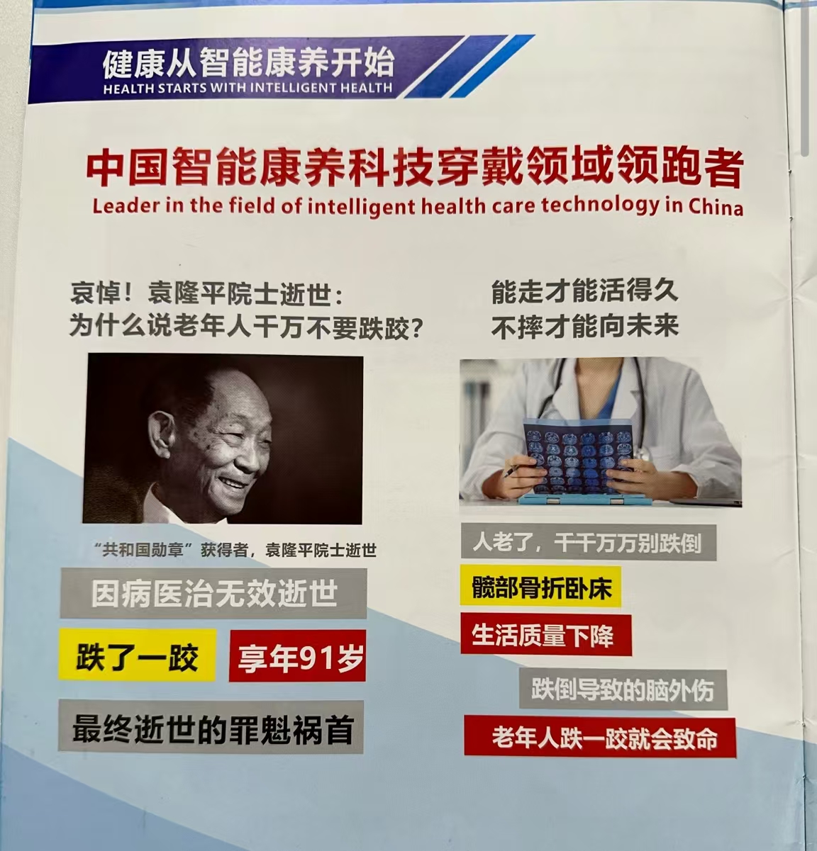 为了说明一双“好鞋”的重要性,步力宝不惜借“杂交水稻之父”“共和国勋章”获得者、已故院士袁隆平“说事”。 记者注意到,手册中印有已逝院士袁隆平的照片,照片的上方写着“哀悼!袁隆平院士逝世:为什么说老年人千万不要跌跤?”照片下方则配文“因病医治无效逝世”“跌了一跤”“享年91岁”“最终逝世的罪魁祸首”,暗示袁隆平袁老因跌倒逝世。 步力宝被媒体曝光后,生产企业河北吉力宝公司法定代表人杨雷在接受媒体采访时“甩锅”经销商,称宣传册可能是经销商自行制作的,并称公司已经对此事展开调查。 但就调查结果,河北吉力宝公司至今仍无公开回应。 “不用吃的保健品”? 在步力宝的对外宣传中,它是一款保健养生的“神鞋”。 “帮你足底按摩的是它,帮你打通微循环的是它,帮你疏通全身经络的是它,帮你排出身体里的寒湿的是它,帮你有个好身体的还是它是它,是它,都是它”……在产品介绍中,步力宝智能穿戴按摩鞋自称是“一种不用吃的保健品”“一个穿在脚上的按摩仪”“一个随身陪伴你左右的养生专家”。