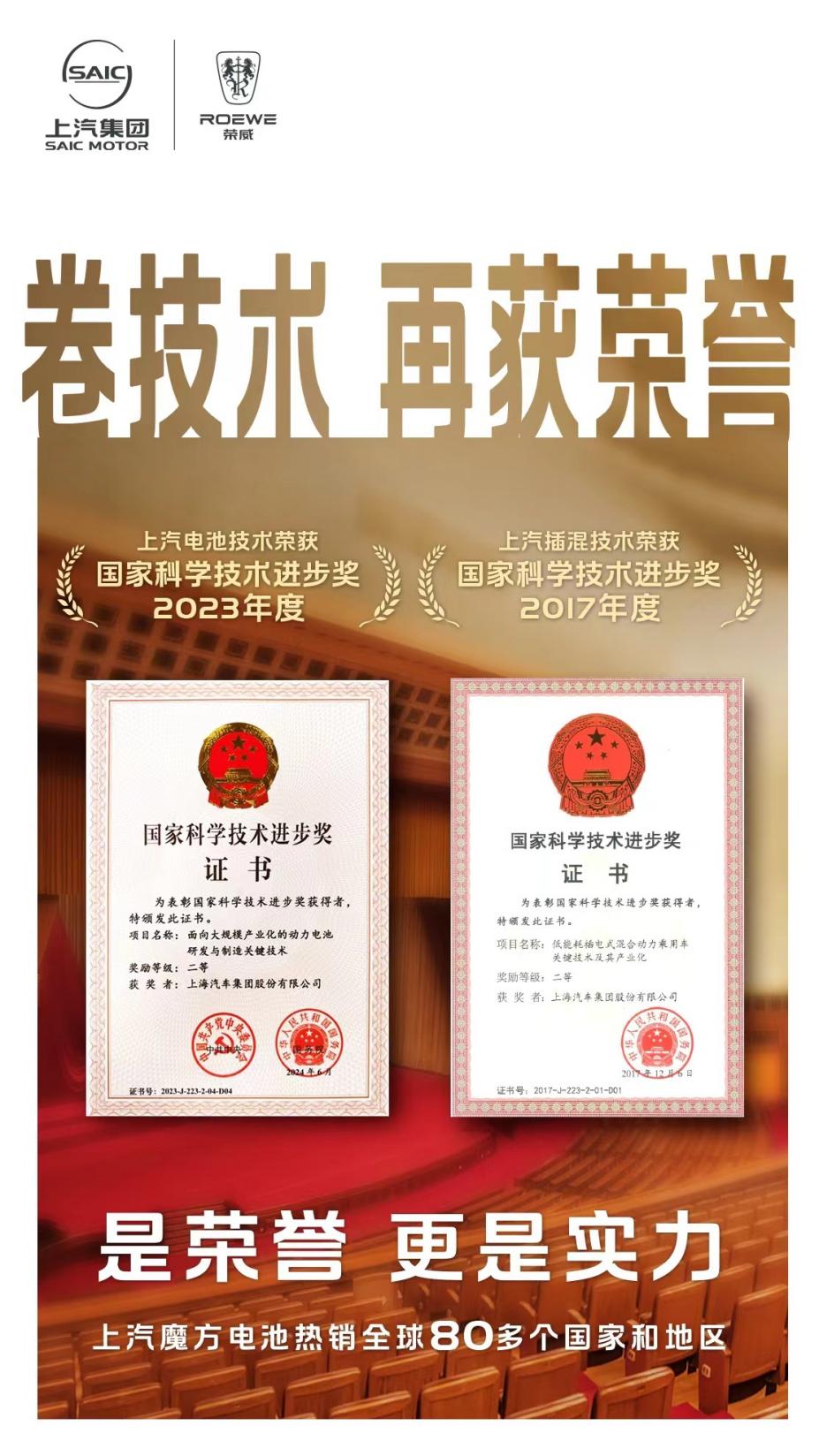 值得一提的是,荣威此次推出的“超级安芯服务”权益政策不仅适用于新车主,还具有回溯效力,让老车主也能安心享受。通过售后保障服务的全面升级与宽松化,为用户打造最高标准的安全守护,充分展现了荣威对用户的关怀和负责任的态度。 全新的标准不仅让车主更加放心购车用车,而且有力地推动荣威新能源车辆保值率的提升。 国家队的担当 荣威技术与品质卷出新高度 荣威敢于成为国内唯一一家向用户推出“超级安芯承诺”权益政策的车企,其底气源自于国家队的技术和品质实力。 6月24日,中国科技界最具权威和影响力的奖项之一,2023年度国家科学技术进步奖正式揭晓,上汽魔方电池以“零热失控”的安全防护体系,以及迄今30万台零自燃记录的出色表现,荣获国家科技进步二等奖登上车企最高领奖台。