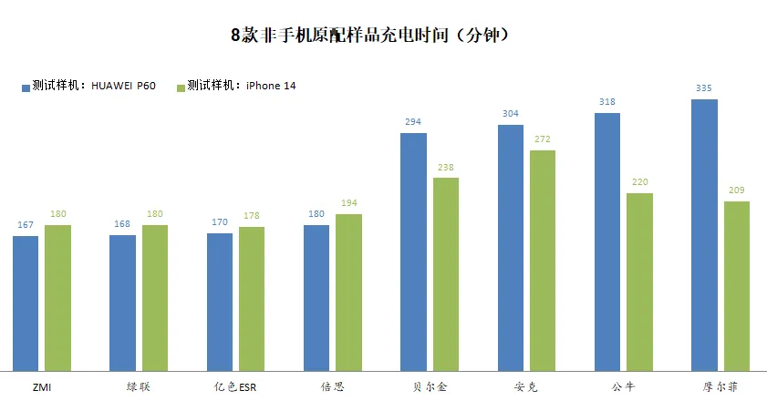 6款金属异物检测未能通过测试要求的样品。资料图片 国产手机原配充电器功率大 上海市消保委指出,充电时间是消费者最关心的性能之一,而充电时间的长短与充电器功率密切相关。在通过安全测试的12款样品中,3款功率为50W,6款功率为15W,3款功率为10W。试验发现,原配充电器均执行私有协议,对自有品牌的相应机型,华为、小米和vivo三款样品均能提供50W功率充电,苹果能提供15W功率充电。非原配充电器只能执行开放协议,功率大多在10W到20W之间。 一般功率越大,充电用时越短。本次比较试验模拟消费者实际使用场景,观察样品将负载机从电量0%充到100%的时间。试验发现,当原配充电器以同品牌支持快充的机型作为负载机时,华为、小米和vivo三款样品的充电用时均在2小时以内,其中华为用时仅64分钟,表现最好;苹果充电用时约2.7小时。当华为和苹果互换充电时,华为50W无线充电器为苹果手机充电的功率可达到11W,用时约2.9小时;苹果15W无线充电器为华为手机充电的功率可达到6.8W,用时近5小时。 针对8款非原配充电器,试验统一选择两款热销手机(HUAWEI P60和iPhone 14)作为负载机,发现8款样品充电时间差异明显,平均用时约3到5小时,其中,对HUAWEI P60负载机的充电时间在2小时47分钟至5小时35分钟之间,对iPhone14负载机的充电时间在2小时58分钟至4小时32分钟之间。ZMI、绿联、亿色三款样品对两台负载机的充电时间均在3小时以内,表现较好。