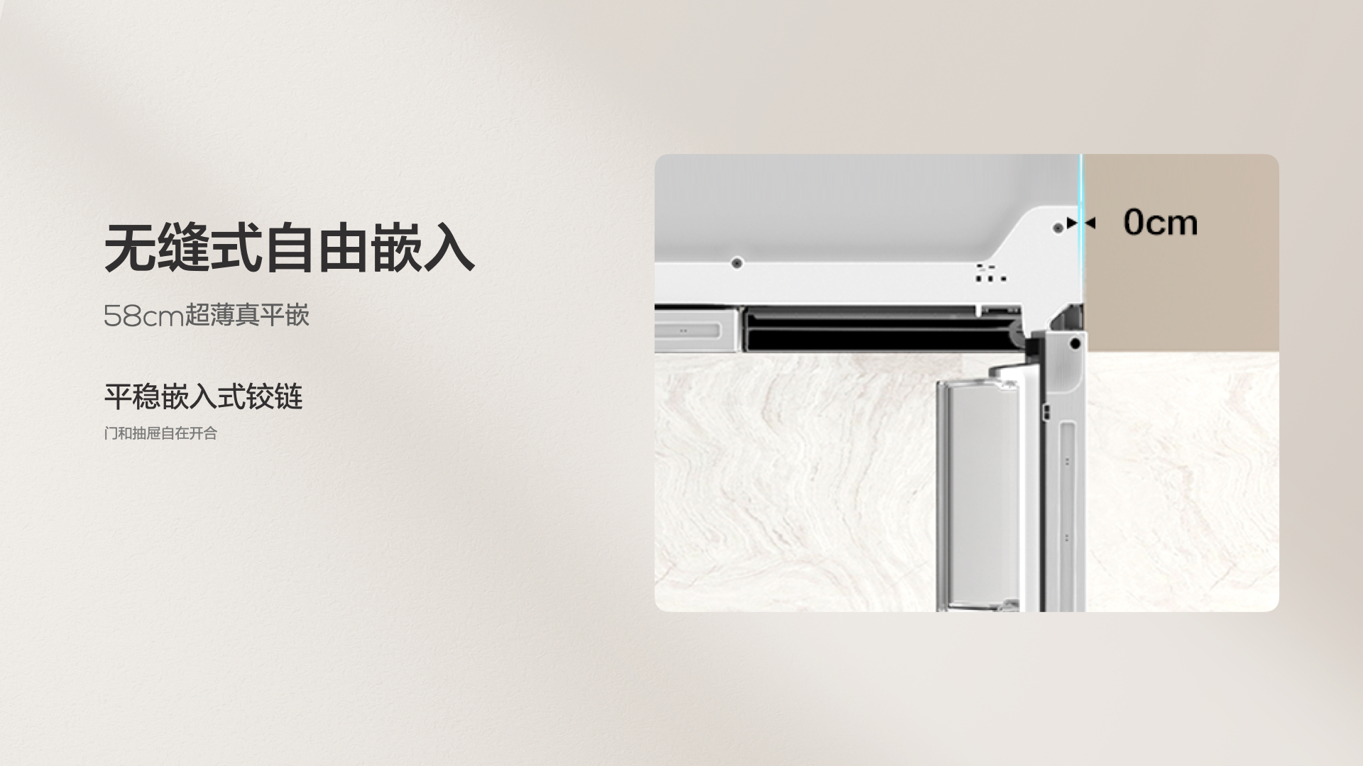 凭借在冰洗领域深厚的创新研发实力,TCL通过140μm微孔发泡技术,实现了仅58cm的超薄机身,即使搭载两个蒸发器和三个独立风道,依然比普通冰箱更轻薄。特意预留的2cm空间,用于应对插座位置、橱柜打孔、墙面垂直误差等各种安装问题。较小的占地面积,使它能够适应厨房转角、走廊过道、客厅边角等复杂的室内场景。而平稳嵌入式铰链和底部散热设计,保证这款产品即使贴墙90º直角开门,也能轻松打开抽屉,使用方便快捷。