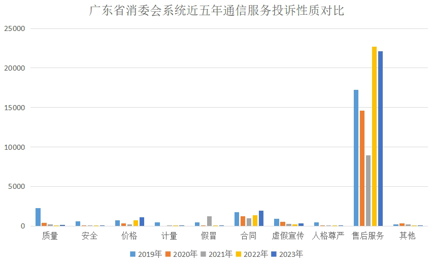 (数据来源:广东省消委会) 从投诉类别来看,近5年通信服务投诉95%以上集中在移动电话服务,与当前通信业发展现状相符(2023年广东固话、移动电话用户数比例约为1:10)。从投诉性质来看,消费者反映的问题主要集中在售后服务、合同和价格3类,其中售后服务问题最为集中,占投诉总量的80.19%,是通信服务类投诉增长变化的主要因素。从地区分布来看,通信服务投诉集中在消费活跃的珠三角地区,主要与经济发展状况、人员密集程度相关。