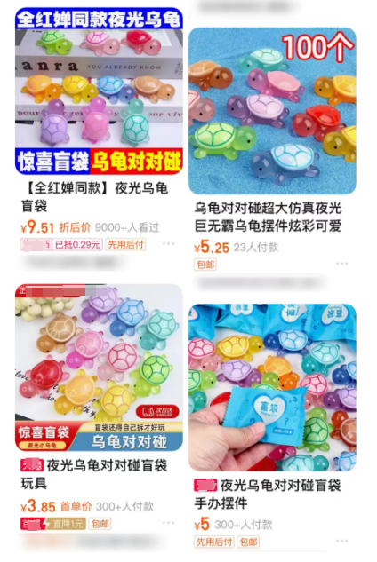 素材来源:@美丽浙江 社交媒体平台 为什么都爱玩“乌龟对对碰”? 情绪价值和不确定性让人“上头” 不少网友表示,去直播间购买乌龟的目的并不是为了买到更有价值的商品,而是享受拆盲盒带来的乐趣和刺激感。 搜索发现,树脂乌龟玩具在电商平台上价格相对便宜,10元能买几十个,但在直播间下单抽盲盒的价格却往往高出许多。