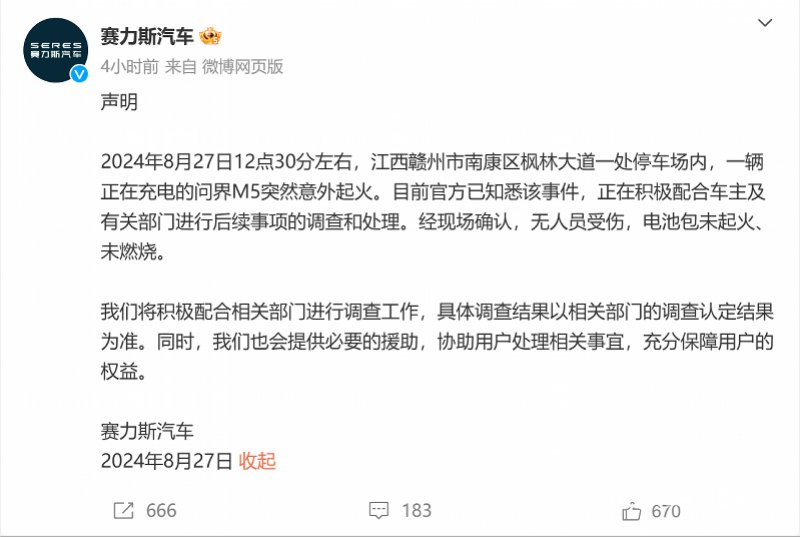 8月27日,有网友于社交平台发布视频显示,一辆插有充电枪的问界M5于露天停车位中起火,期间该车前车窗处发生小范围爆炸。 当日晚间,赛力斯汽车于微博发布声明。声明指出,此事故系2024年8月27日12点30分左右,江西赣州市南康区枫林大道一处停车场内发生,一辆正在充电的问界M5突然意外起火。 目前官方已知悉该事件,正在积极配合车主及有关部门进行后续事项的调查和处理。经现场确认,无人员受伤,电池包未起火、未燃烧。 公司将积极配合相关部门进行调查工作,具体调查结果以相关部门的调查认定结果为准。同时,公司也会提供必要的援助,协助用户处理相关事宜,充分保障用户的权益。