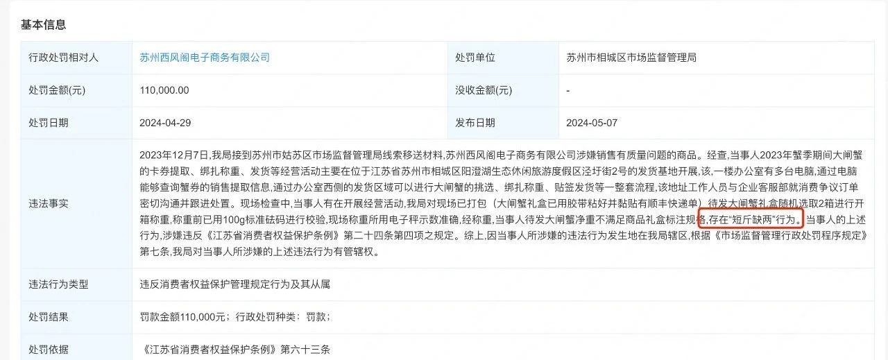 处罚事由显示,监管人员对现场待发大闸蟹礼盒随机选取2箱进行开箱称重,当事人待发大闸蟹净重不满足商品礼盒标注规格,存在“短斤缺两”行为。