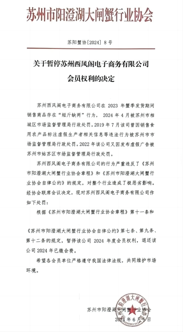 值得一提的是,2024年6月,苏州阳澄湖大闸蟹行业协会已发布公告称,暂停该公司2024年度会员权利,退还该公司2024年已缴会费。 |