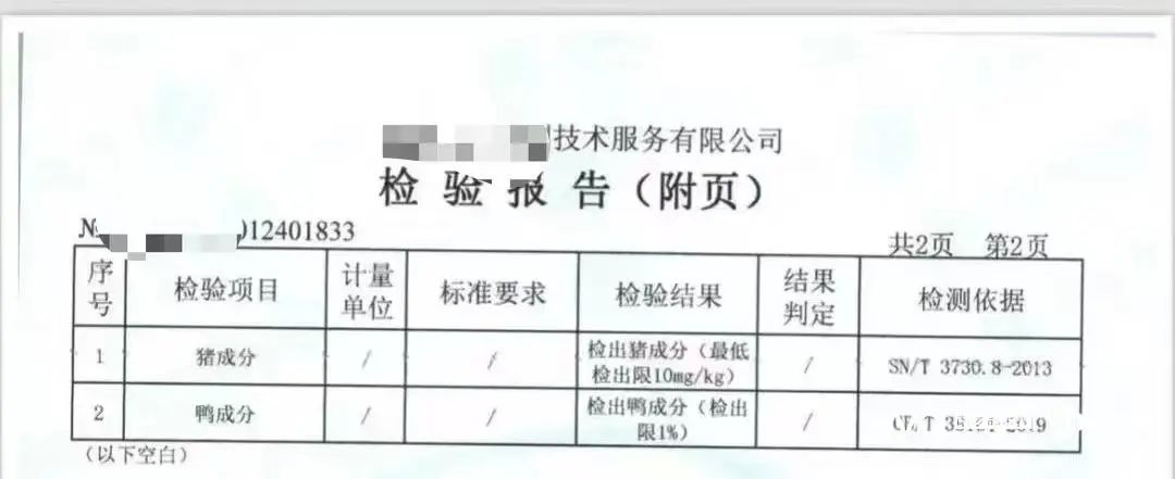 根据南都湾财社记者获取的检测报告,此次检测的样品为用塑料盒包装的210g的极品羊上脑,检测日期为7月29日,第三方机构采用的检测方式为《SN/T3730.8-2013》和《GB/T38164-2019》,均为常用的畜禽动物源性成分的定性检测方法,8月17日,检测结果出炉:送检的极品羊上脑被检测出了猪成分和鸭成分。
