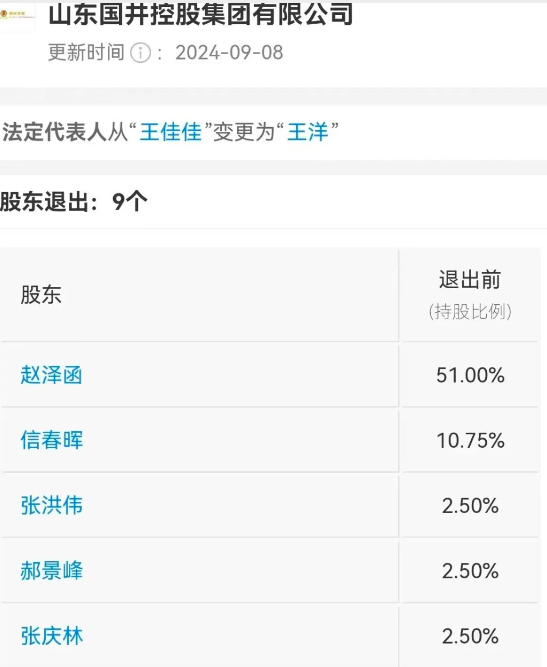 ![]() 在这次股权转让之前,国井控股集团大股东是赵纪文之子赵泽函,持股51%,股权转让之后,这51%的股份拥有者变成了王晨,王洋则持股28.25%,而王洋也成为国井控股集团执行董事、法定代表人。 更早的2023年1月5日,扳倒井股份董事长赵纪文将其持有的58.3%的股份全部转让给了淄博慢城房地产开发有限公司。 工商登记资料显示,淄博慢城房地产注册成立于2022年6月20日,法定代表人为王增军,注册资本4200万元,该公司由淄博众志达管理服务有限公司全资持有。淄博众志达管理服务有限公司则注册成立于2023年2月24日,注册资本4200万元,法定代表人为陈洪海,陈洪海与赵军分别持股99.52338%和0.4762%。 不过,令外界感到蹊跷的是,虽然国井控股集团以及扳倒井股份的控股权已经易主他人,但是赵纪文却至今仍然以国井集团党委书记、董事长的身份出席活动并见诸媒体报道。 在9月12日举行的“2024山东国井集团开窖大典”活动当天,已在工商登记中卸任董事长的赵纪文仍以国井集团董事长的身份发表讲话,不再担任集团股东、董事的张辉、白秀彬、张锋国则分别以集团常务副总裁、副总裁、副总裁和总工程师的身份出席此次活动。而第一和第二大股东王晨、王洋却罕见地没有出现在活动报道中。 近日,在江苏举办的《2024第五届白酒黄淮核心产区高质量发展峰会》上,赵纪文仍然以中国酿酒大师、国井集团党委书记、董事长身份出席并作了《经略黄河,涵养国香》主题演讲。 ![]()