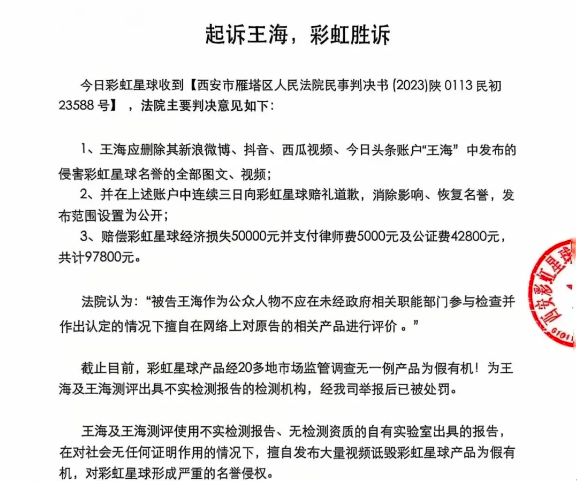 彩虹星球起诉王海一审胜诉 创始人称欢迎消费者正常监督