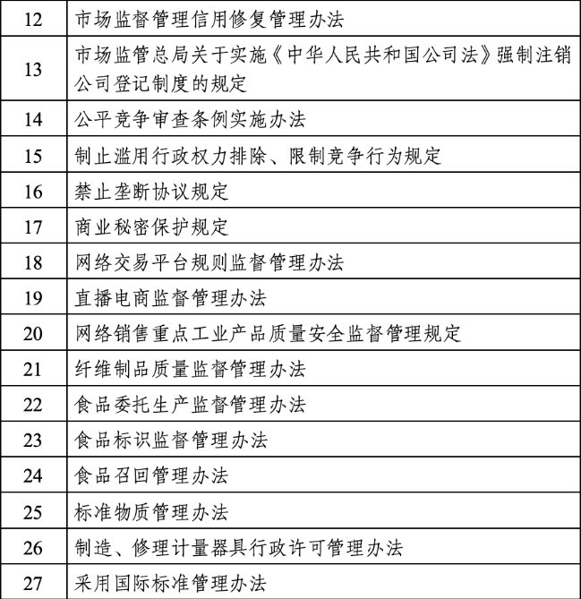 ![]() 在推动市场准入提质增效,促进经营主体健康发展方面,拟制定经营主体登记档案管理办法、市场监督管理信用修复管理办法、市场监管总局关于实施《中华人民共和国公司法》强制注销公司登记制度的规定等规章。 ![]() 在提升公平竞争政策实施效能,营造公平公正市场环境方面,拟推动修订禁止传销条例,制修订公平竞争审查条例实施办法、禁止垄断协议规定、商业秘密保护规定以及制止滥用行政权力排除、限制竞争行为规定等规章。 ![]() 在健全平台经济常态化监管制度,促进平台经济规范发展方面,拟制定网络交易平台规则监督管理办法、直播电商监督管理办法、网络销售重点工业产品质量安全监督管理规定等规章。 ![]() 在强化质量支撑和标准引领,提升质量发展水平方面,拟推动修订产品质量法、认证认可条例等法律、行政法规,制修订纤维制品质量监督管理办法、标准物质管理办法、采用国际标准管理办法以及制造、修理计量器具行政许可管理办法等规章。 ![]() 在防范化解“三品一特”重大安全风险,守牢安全底线方面,拟推动制修订食品安全法、医疗器械管理法、工业产品生产许可证管理条例、特种设备安全监察条例、中药品种保护条例等法律、行政法规,制修订食品委托生产监督管理办法、食品标识监督管理办法、食品召回管理办法等规章。