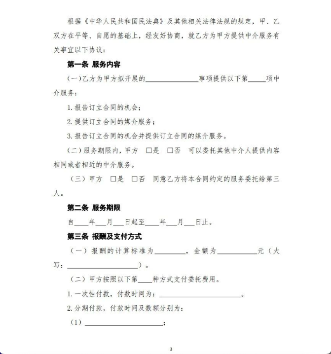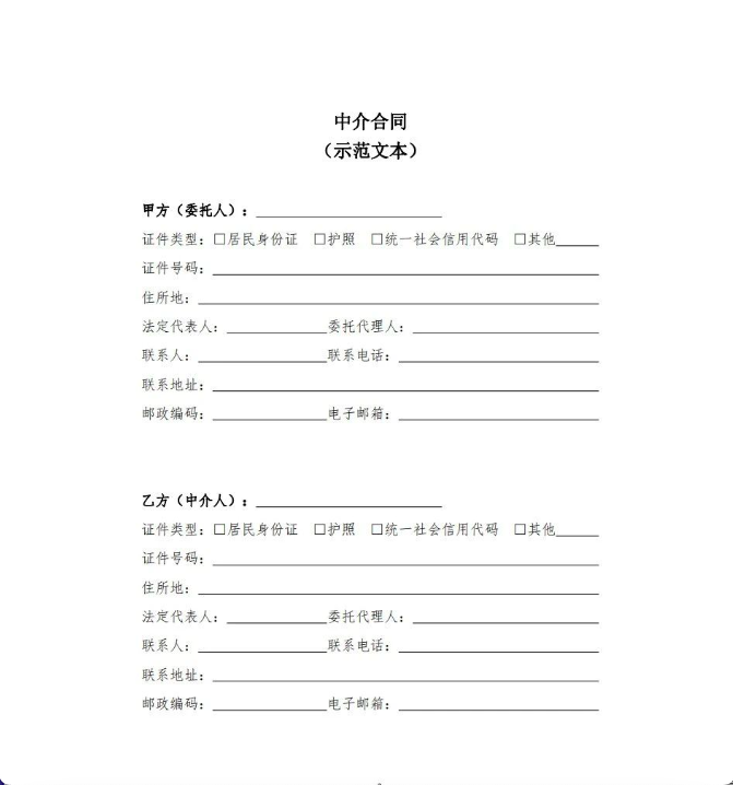 市场监管总局办公厅关于印发《中介合同(示范文本)》的通知 各省、自治区、直辖市和新疆生产建设兵团市场监管局(厅、委): 为落实《中华人民共和国民法典》有关规定,提升合同示范文本的专业性和规范性,市场监管总局对原工商总局制订的《居间合同(示范文本)》(GF—2000—1201)进行了修订。根据《中华人民共和国民法典》的最新表述,将原《居间合同(示范文本)》变更为《中介合同(示范文本)》。现将修订后的《中介合同(示范文本)》(GF—2025—2613)印发给你们,供社会公众参照使用。修订之前的原合同示范文本同时废止。 市场监管总局办公厅 2025年3月4日 附件 《中介合同(示范文本)》(GF—2025—2613)