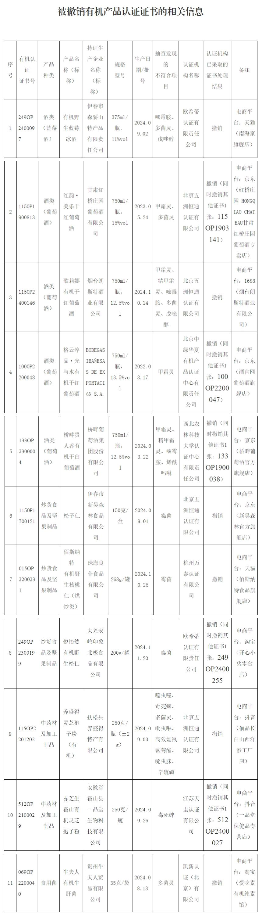 近日,市场监管总局通告2025年度认证有效性抽查结果,11批次抽样产品不符合认证要求。对不符合认证要求的获证企业,作出撤销16张有机产品认证证书的处理。 ![]() 据悉,此次抽查对有机产品认证领域(有机粮食加工品、食用菌、茶叶、酒类、肉制品、坚果制品、中药材及加工制品7类产品)的40家认证机构涉及的150批次产品实施了认证有效性抽查。抽查发现11批次抽样产品不符合认证要求。 1.伊春市森骄山特产品有限责任公司的有机野生蓝莓冰酒,不合格项目:嘧霉胺、多菌灵、戊唑醇。撤销欧希蒂认证有限责任公司有机认证证书(249OP2400097)。 2.甘肃红桥庄园葡萄酒有限公司的红韵·美乐干红葡萄酒,不合格项目:甲霜灵、多菌灵。撤销北京五洲恒通认证有限公司有机认证证书2张(115OP1900813、115OP1903141)。 3.烟台朗斯特酒业有限公司的歌莉娜有机干红葡萄酒,不合格项目:甲霜灵、精甲霜灵、嘧霉胺、多菌灵、戊唑醇。撤销北京五洲恒通认证有限公司有机认证证书(115OP2400146)。 4.BODEGAS IBAÑESAS DE EXPORTACIóN S.A.的格云淳品·光与水有机干红葡萄酒,不合格项目:甲霜灵。撤销北京中绿华夏有机产品认证中心有限责任公司有机认证证书2张(100OP2200048、100OP2200047)。 5.桥畔葡萄酒集团股份有限公司的桥畔贵人香有机干白葡萄酒,不合格项目:甲霜灵、精甲霜灵、嘧霉胺、烯酰吗啉。撤销西北农林科技大学认证中心有限责任公司有机认证证书2张(133OP2300004、133OP1900038)。 6.伊春市新昊森林食品有限公司的松子仁,不合格项目:霉菌。撤销北京五洲恒通认证有限公司有机认证证书(115OP1700121)。 7.珠海良仆食品有限公司的佰斯纳特有机野生核桃仁(烘炒类),不合格项目:霉菌。撤销杭州万泰认证有限公司有机认证证书(015OP2200231)。 8.大兴安岭印象北极食品有限公司的悦怡然有机野生松仁,不合格项目:霉菌。撤销欧希蒂认证有限责任公司有机认证证书2张(249OP2300199、249OP2400255)。 9.抚松县养盛得特产有限公司的养盛得灵芝孢子粉(有机),不合格项目:噻虫嗪、毒死蜱、多菌灵、吡虫啉、高效氯氟氰菊酯、啶虫脒、辛硫磷。撤销北京五洲恒通认证有限公司有机认证证书(115OP2201202)。 10.安徽省霍山县一品堂生物科技有限公司的赤芝生霍山有机灵芝孢子粉,不合格项目:毒死蜱。撤销江苏天圭认证有限公司有机认证证书2张(512OP2100029、512OP2400027)。 11.贵州牛夫人贸易有限公司的牛夫人有机牛肝菌,不合格项目:多菌灵。撤销凯新认证(北京)有限公司有机认证证书(069OP2200040)。 ![]() |