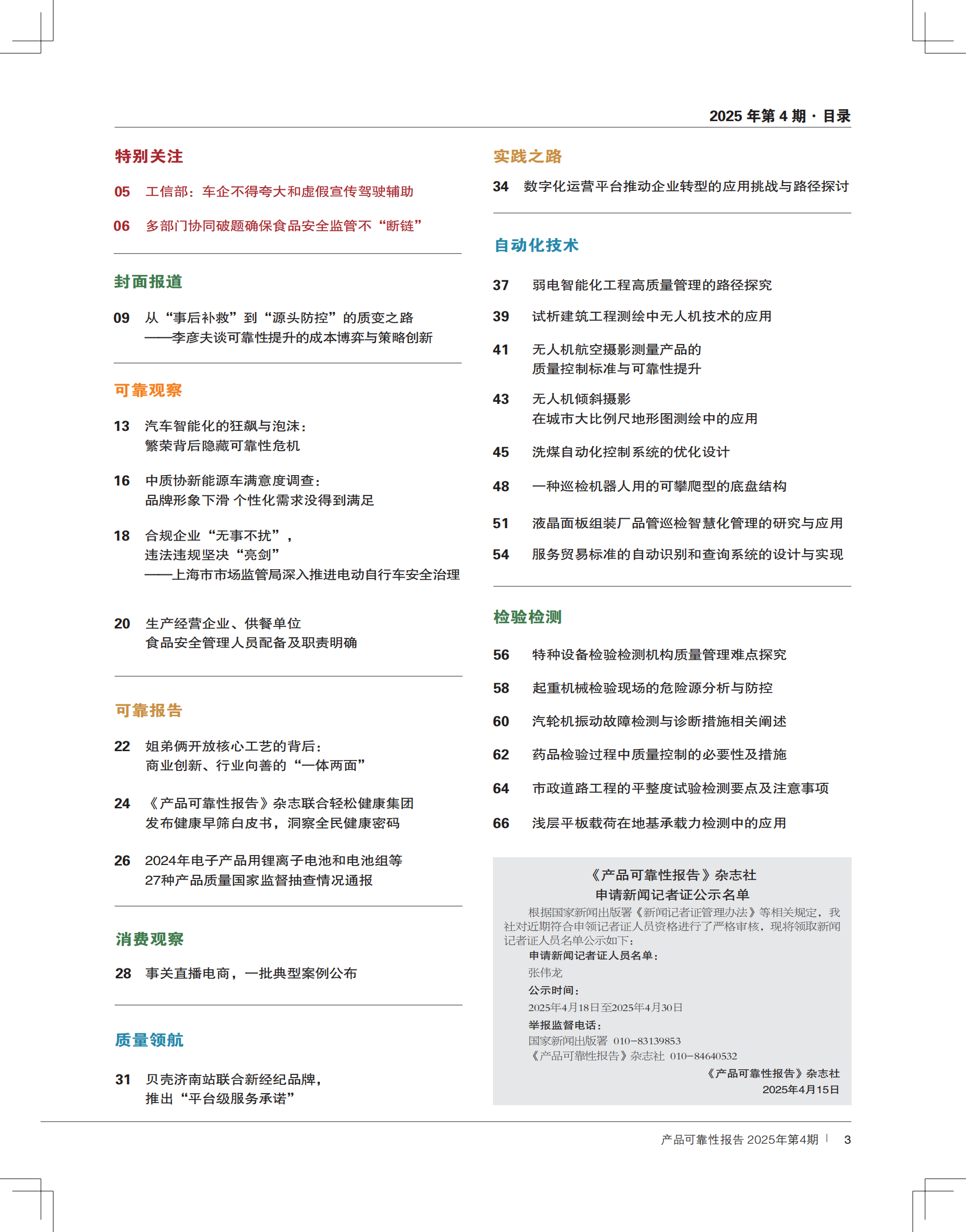 ![]() 本期热点: 工信部:车企不得夸大和虚假宣传驾驶辅助; 多部门协同破题确保食品安全监管不“断链”; 从“事后补救”到“源头防控”的质变之路 ——李彦夫谈可靠性提升的成本博弈与策略创新; 汽车智能化的狂飙与泡沫: 繁荣背后隐藏可靠性危机; 姐弟俩开放核心工艺的背后: 商业创新、行业向善的“一体两面”;《产品可靠性报告》杂志联合轻松健康集团发布健康早筛白皮书,洞察全民健康密码; 事关直播电商,一批典型案例公布。