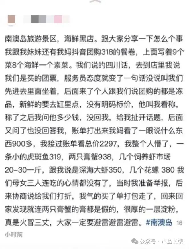 ![]() 游客称当时准备举报 店员后来协商打折 她气得付款后打包带走 回去后怀疑膏蟹的膏是假的 有很厚的淀粉 ![]() ![]() 该视频发布后 不少人在评论区晒出同样的经历 7月4日,据第一现场 记者联系了汕头市南澳县市场监督管理局 相关工作人员告诉记者 之前也有收到过这家店的相关投诉 也经常对这家店的价格和卫生等方面进行检查 7月3日,相关部门前去处理这家餐厅 现在已经将其查封 目前,该餐厅在某团购平台 已显示暂时停业 ![]() |