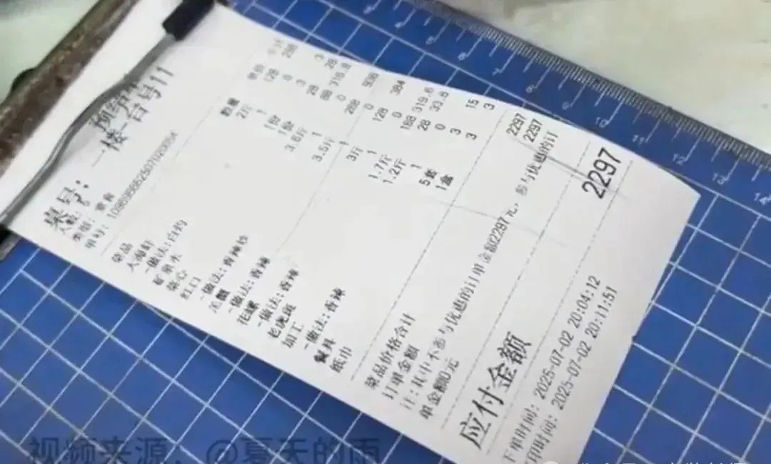 近日 一游客发布视频称 她在广东省汕头南澳岛旅游 花了318元在某平台购买了 某海鲜餐厅一个8份海鲜1份素菜的套餐 ![]() 到店后店员听到他们说的是四川话 就以团购都是冻品为由 让他们新鲜的要去缸里点 问价格也不说 称完直接打出一张2297元的账单让核对 其中,一条小虎斑鱼319元 两只膏蟹938元、“深海大虾”350元