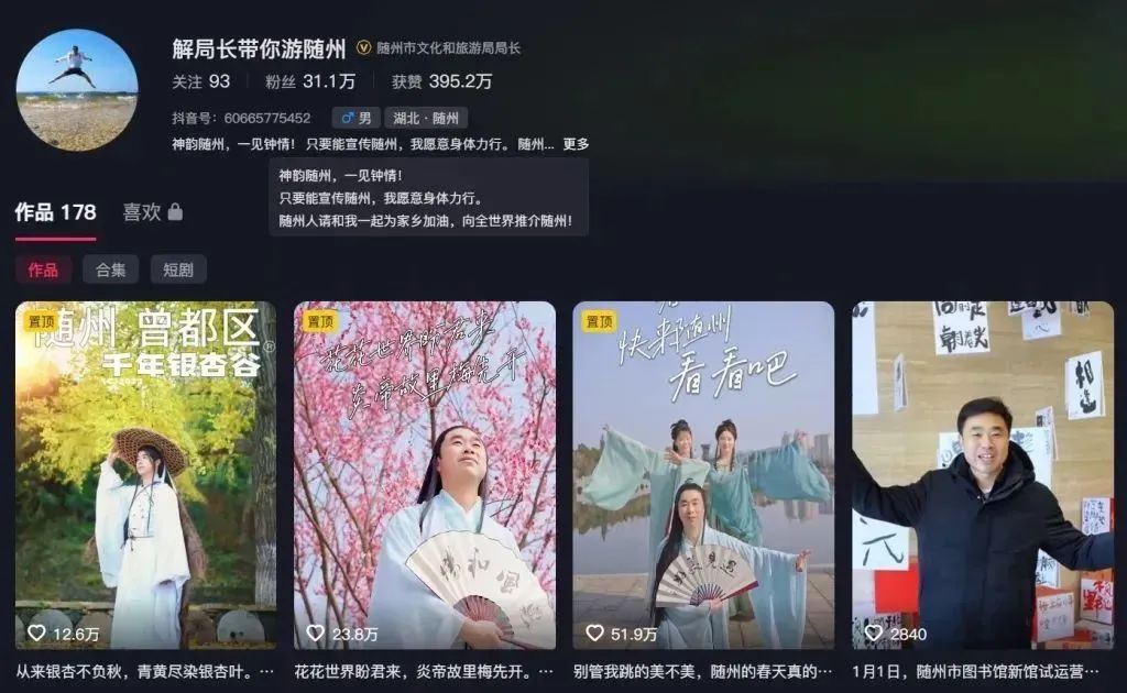 解伟在短视频中的扮相。 此前,解伟的账号“解局长带你游随州”认证为“随州市文化和旅游局局长”,已发布187条作品,粉丝31万,获赞395.4万次。解伟最近一次的作品,系2025年1月2日发布的一则关于随州市图书馆新馆试运营的视频。 ![]() 解伟曾因短视频意外出圈,成为“网红局长”。2022年5月起,他发布了多期“解局长带你游随州”短视频,一度化身《西游记》里的唐僧带着徒弟游园,也曾换上原始人装扮,穿越成为神农部落首领。走向镜头之前,解伟曾有20多年的基层工作经历。 “虽然以‘丑’出圈,但不能以‘丑’为风格。”2022年11月,解伟接受记者采访时说,“哪怕目前还没有大的游客量或者成效显现,但相信会逐步转化。” |