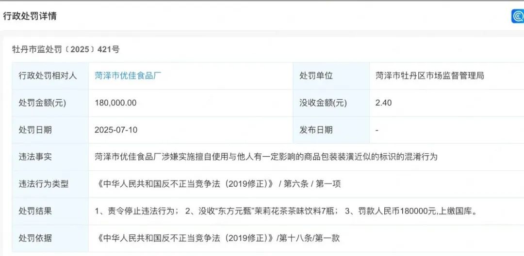 买东方树叶收到东方爽茶,涉事生产企业被罚18万元