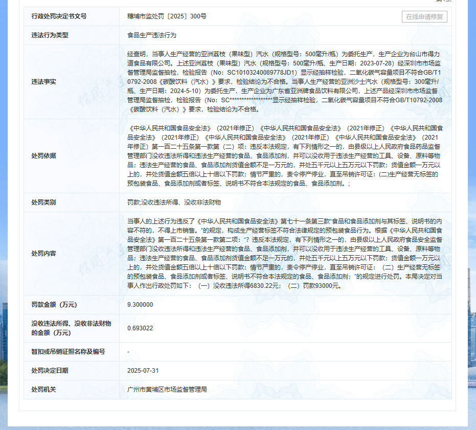 食品生产违法,亚洲汽水被罚
