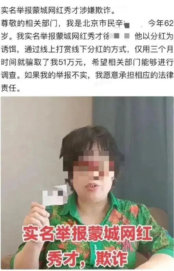 近日,记者发现在抖音上一个名为@王老四 的账号里,疑似此前被封禁的千万网红@秀才 在视频里出镜。 ![]() 秀才疑在他人视频出镜 该账号首个发布的疑似@秀才 出镜的视频里,不仅呈现了@秀才 以往相似的视频风格,在配文里,打上了#秀才 的标签,并写明和秀才老师合拍一下。 这条7月23日发布的视频,目前已经获得超过41.4万赞,2.7万条留言,45.7万条转发。在评论区里,已经聚集了不少原来@秀才 的粉丝,且在一条@秀才 粉丝表达祝福的留言里,视频作者给予了回复:感谢支持。 ![]() 网友评论截图 目前,该账号共计3.2万粉丝,获得超过118万赞,在已经上传的11条视频里,有10条视频都有@秀才的出镜。 该账号11条视频中有10条都有秀才出镜 秀才2023年被封禁 据红星资本局2023年9月3日消息,9月2日晚间,抖音千万粉丝的主播“秀才”账号被封禁。 随后,#秀才账号被封##秀才被举报涉嫌税收违法#等,多个话题登上微博热搜,引发热议。 2023年9月2日晚间,抖音网红“秀才”账号,由于违反《抖音社区自律公约》相关规定,已被封禁。抖音页面显示,秀才拥有粉丝1200多万,作品获赞超过2.0亿,曾被称为“中老年妇女收割机”。 据九派财经报道,知情人士透露,秀才被举报存在违法行为,这可能是他被封禁的部分原因。9月2日晚,亳州市税务局一名负责人表示,确已收到针对徐某某(网名秀才)的举报材料,“涉及到个人所得收入申报情况”,相关调查工作正在进行中。 此前有网友举报秀才指控涉嫌欺诈,一名来自北京的62岁女性在网上称自己实名举报秀才,以分红为诱饵,通过线上打赏线下分红的方式,用三个月时间骗取了自己51万元。针对网友涉嫌欺诈的指控,当地警方表示,已经与举报人见面了解情况,并根据其提供的线索进行调查,未发现违法犯罪行为,后双方自行达成和解。 ![]() 北京女子实名举报秀才 图源九派新闻 超8成粉丝为女性,大于50岁的中老年居多 秀才的视频场景多选在乡村,梳的精致油头,穿西装或衬衫,每当镜头靠近时,秀才就会微笑、撩头发,同时对口型开始唱歌。 ![]() 秀才此前视频截图 此前,据澎湃新闻报道,吉林省某72岁老太因迷恋秀才,花费大量退休金给秀才打赏,还驱车从吉林奔赴亳州想要见其一面,但被拒绝。面对网友的劝解,老人不为所动,而是反问:“上岁数就不兴见网友了?” 在秀才走红之际,另一位女主播“一笑倾城”也在抖音爆火,二人被一起称为“中老年人的收割机”。 8月16日晚,秀才和一笑倾城在直播间进行了一场连麦PK,谁的粉丝刷的礼物更多,谁就能赢下这场PK。据了解,当晚直播间在线人数突破10万,累计超过2000万人观看,几乎每一种礼物特效都出现了不止一遍。 ![]() 秀才和一笑倾城在直播间进行连麦PK 第三方数据平台蝉妈妈统计显示,未封禁时,秀才抖音账号的粉丝画像中女性居多,占据总人数的86.98%,而一笑倾城1909万抖音粉丝中,78.93%的用户注册为男性。两人的粉丝里,主流都是年龄大于50岁的中老年。 |